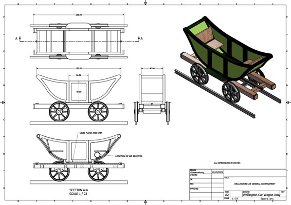 Below: Blog readers may recall that in 2019 we built a two-foot gauge interpretation of the Wellington carriage (sketch and photo shown here), so it is nice to revisit this project and create a useful piece of rolling stock with an engaging story behind it that hopefully our visitors will greatly enjoy riding in.