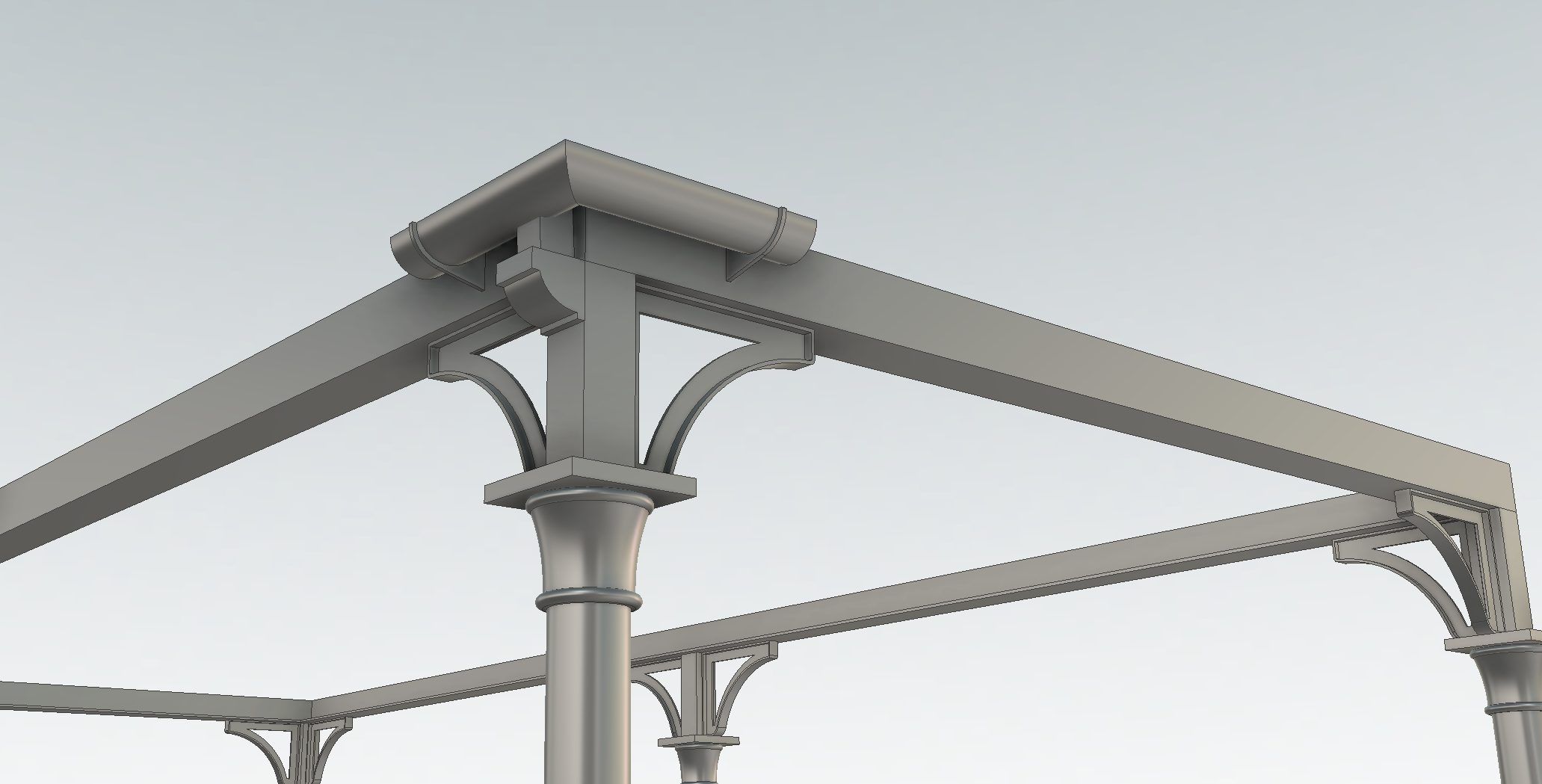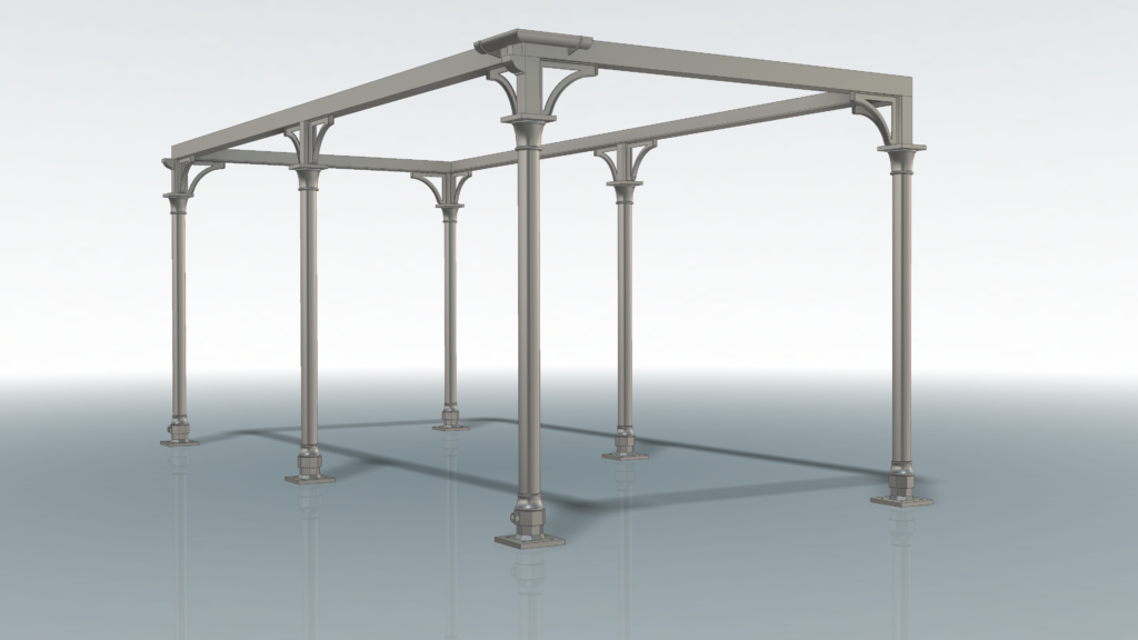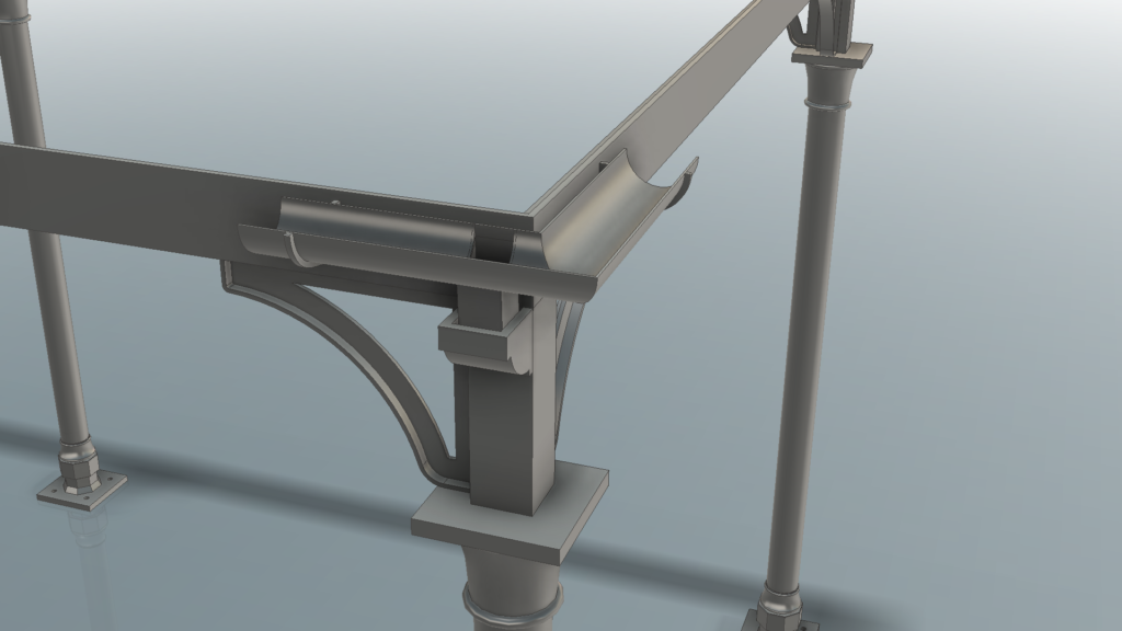 Below: An assembly view showing the guttering in relation to the columns with the integral downpipes and spouts (visible at the base of the nearest and furthest left column).