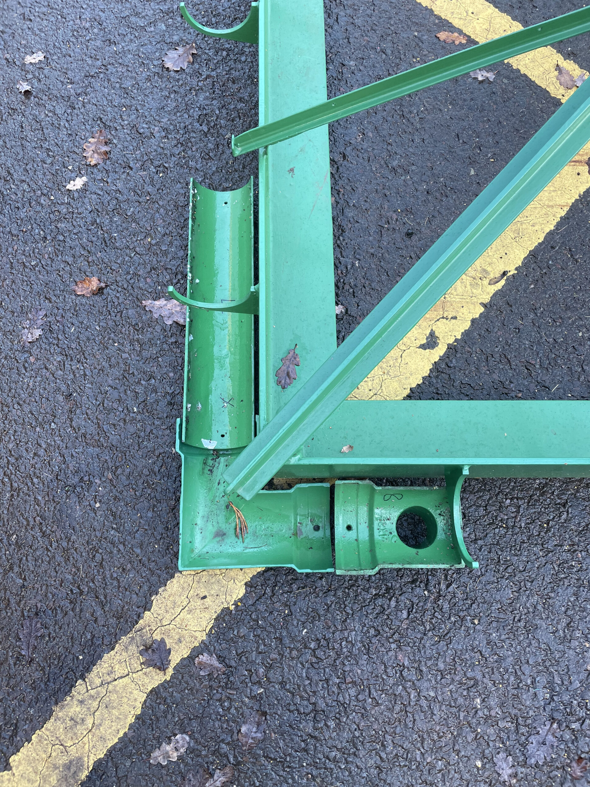Below: The guttering was supplied in component form, and is cast iron and sits inside the brackets, which are welded to the main roof frame. The corner pieces, however, do not align with the cast hoppers that are integral to two of the legs of the shelter – the downpipe is integral to the column and a spout at its base throws the water clear of the structure.