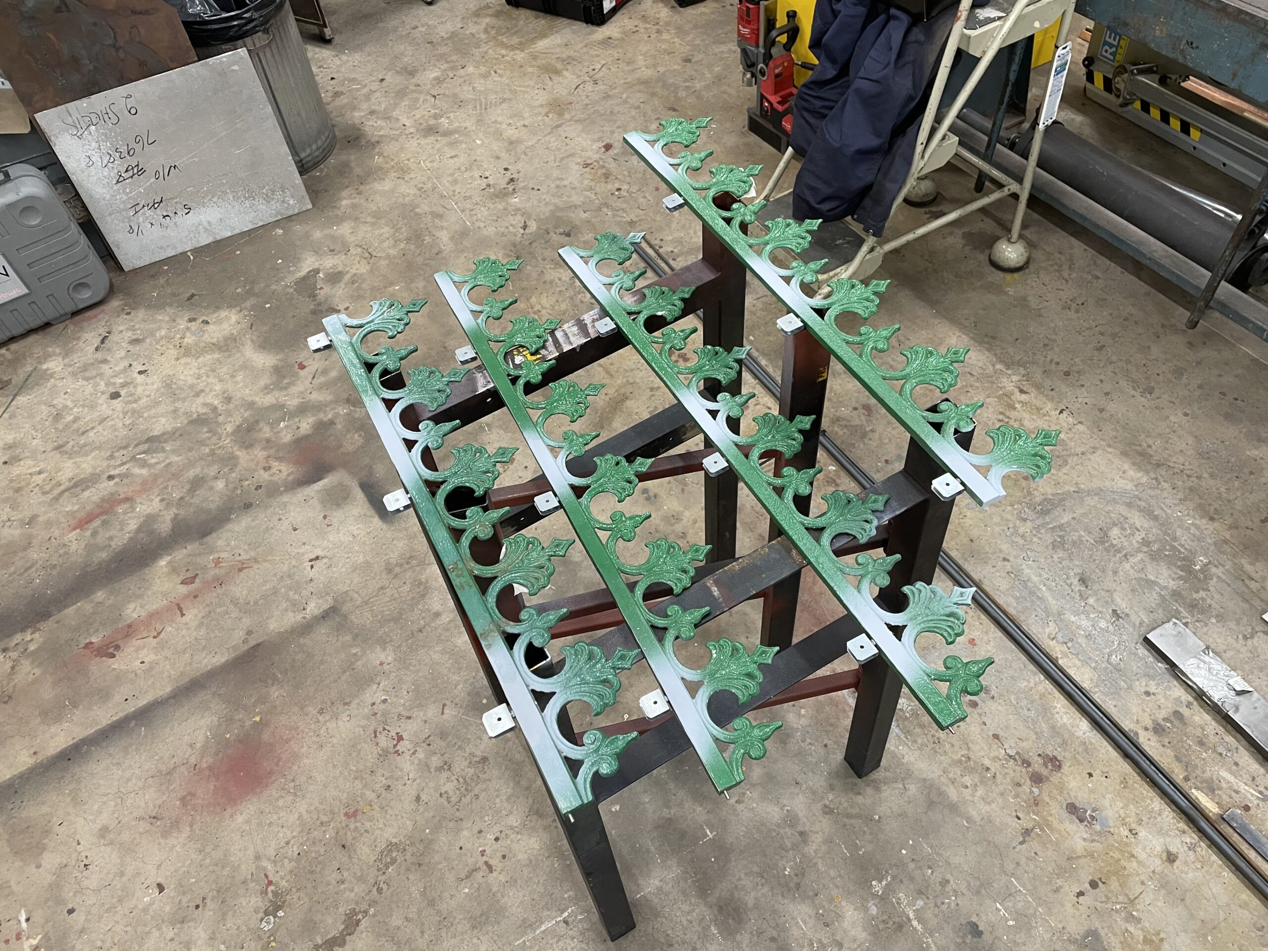Below: The completed base and fencing, pending erection of the shelter. The roof frame is slightly out of square, so Chris has accommodated this into the plans to assemble the columns onto the base and then place the roof structure onto this. This will be welded to the side brackets of the columns (which are steel) as there is very little space to fit bolts of sufficient strength. This whole section was missing when restoration started so there was nothing to copy, the frame being the strongest and most sensible way of proceeding with the restoration process.