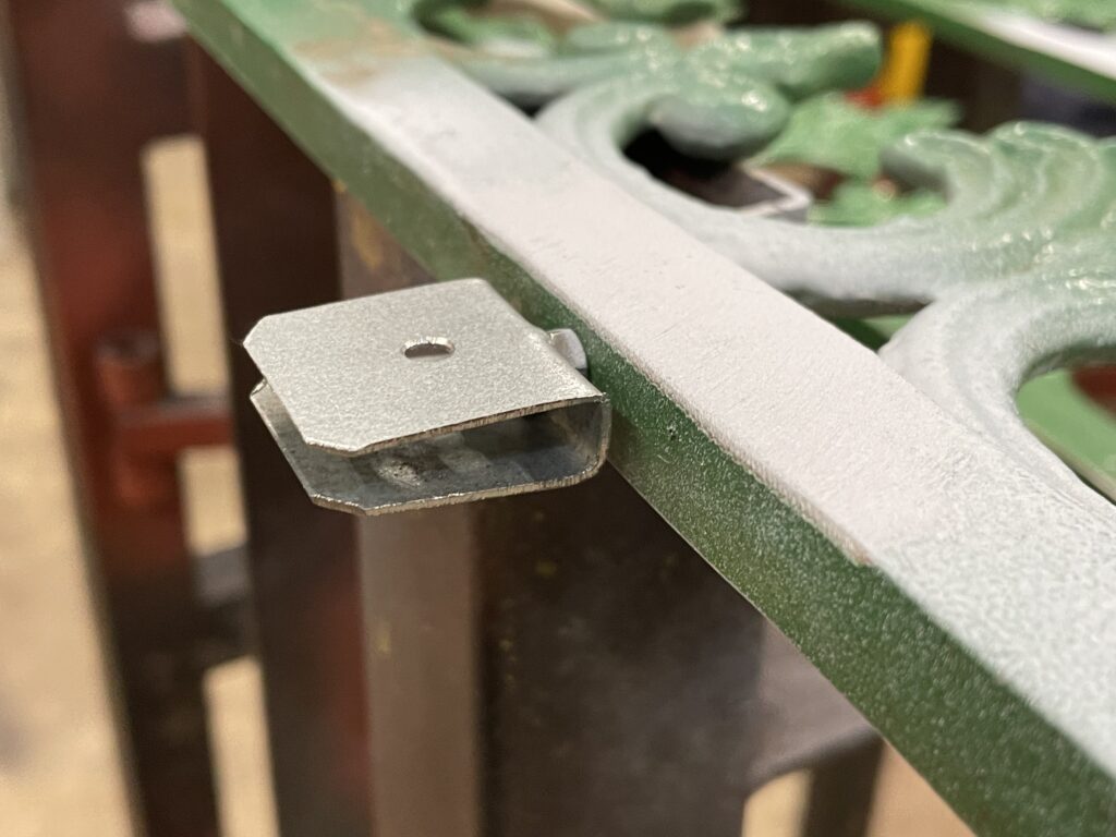 Below: The cast finial/crenellations have had to be modified so that they have tabs that fit over the ridge of the steel roof structure. The second view shows a close-up of the means of securing them in position.