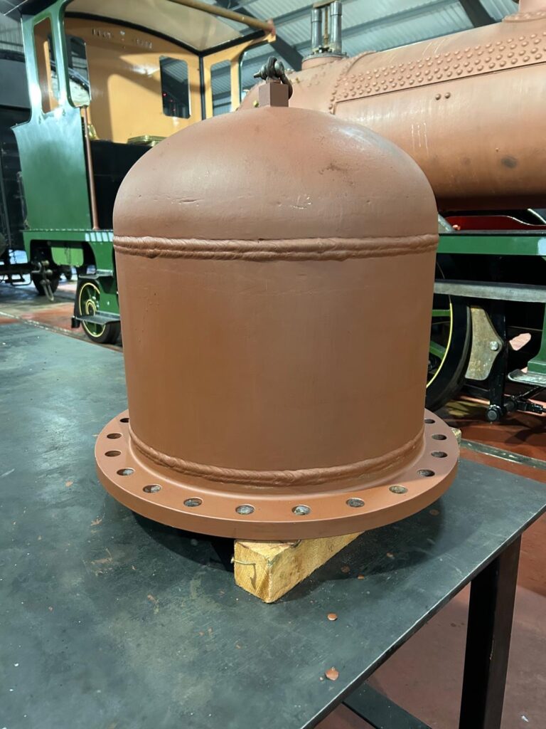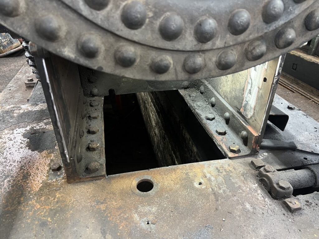 Below: The dome cover has been removed to expose the J pipe (and allow its removal) – this being the component upon which the regulator acts to control the flow of steam from the boiler (at its driest point within the dome) to the cylinders (via the main steam pipe, sometimes known as ‘dry pipe’ within the boiler vessel itself). There was some evidence of leaking in the new J pipe casting during hydraulic testing, so a repair or replacement option is being explored to rectify this.