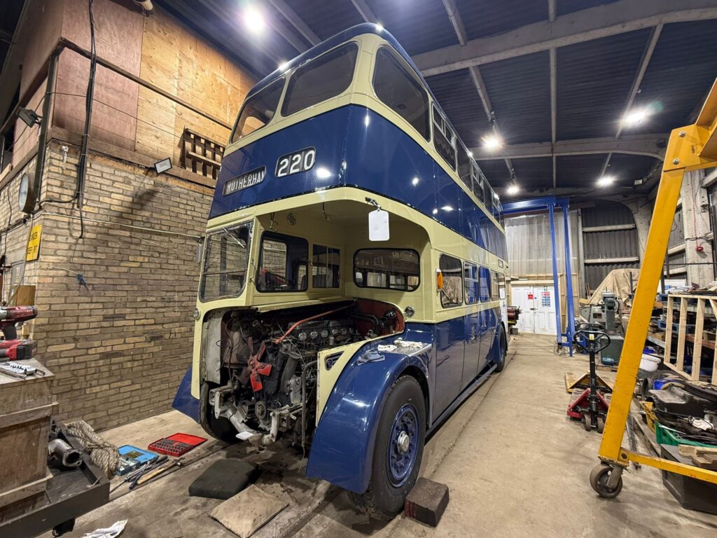 Below: Rotherham 220, with newly upholstered seats back on site, has moved to the rear of the tram depot to be prepared for its engine transplant.