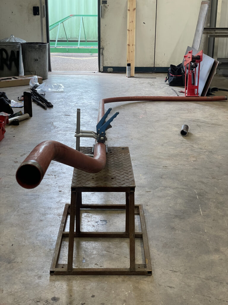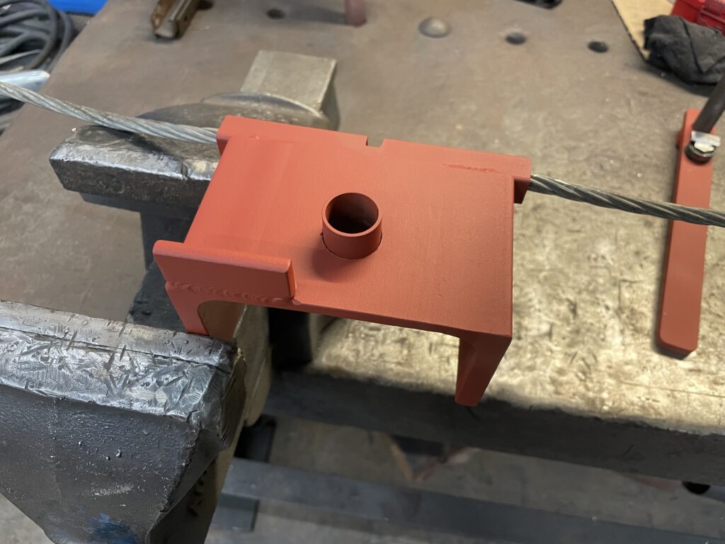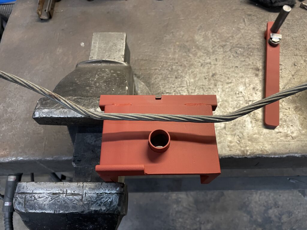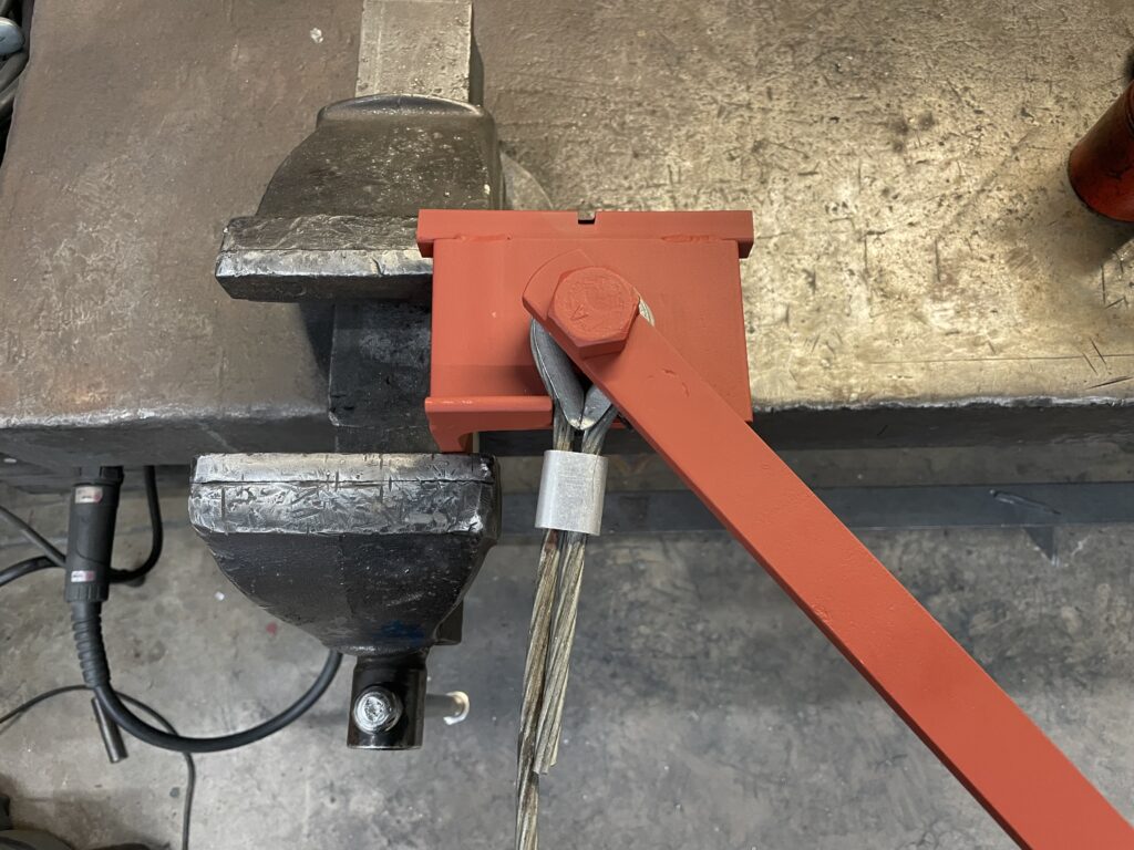 This photo shows the spanwire inserted into a square tube that is attached to the jig. This then allows two pre-bending operations to be carried out.