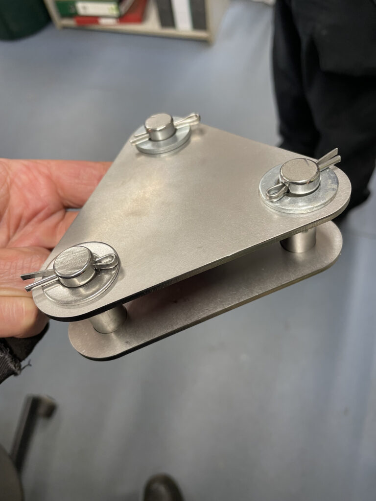 Below: As part of the process of replacement of spanwires, new clevis links have been designed and laser-cut from stainless steel (for longevity and future ease of dismantling). Here are examples of the two into one (or one into two) links.
