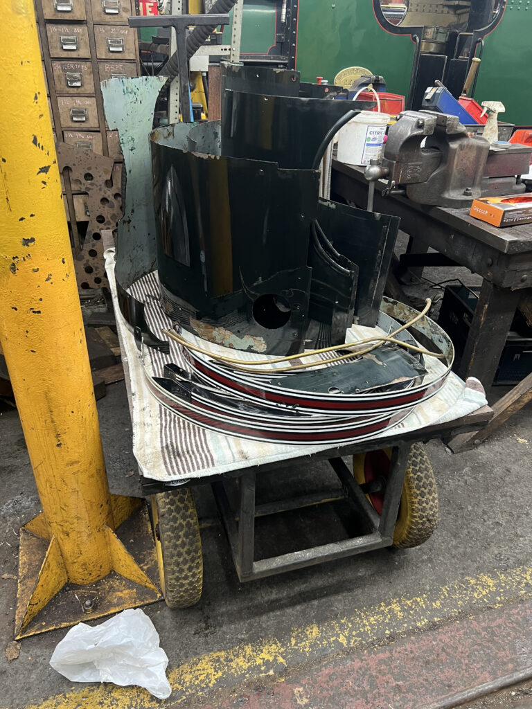 Below: After another session of dismantling – this is the barrow full of wooden cladding spacers after removal. These cannot be re-used so new wooden lagging will be made when the boiler is reassembled.
