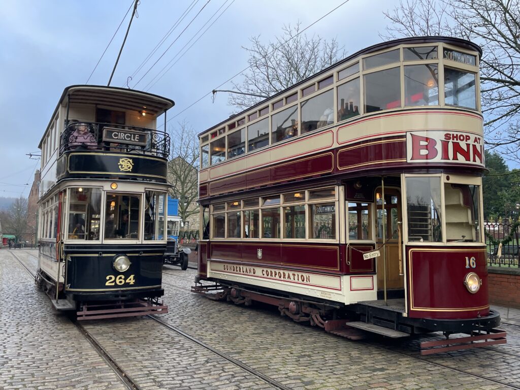 Below: The familiar winter operation sight – Sheffield 264, Sunderland 16 and the B-Type bus. Blackpool 31 and Oporto 196 have also been out (the latter being a popular driver-training tramcar). KPT 909, the Scouts Leyland and Crossville 716 have provided an all-Leyland bus service on weekdays too – the engine in the B-Type replica is a Leyland 401 diesel engine, so after a fashion this counts too!
