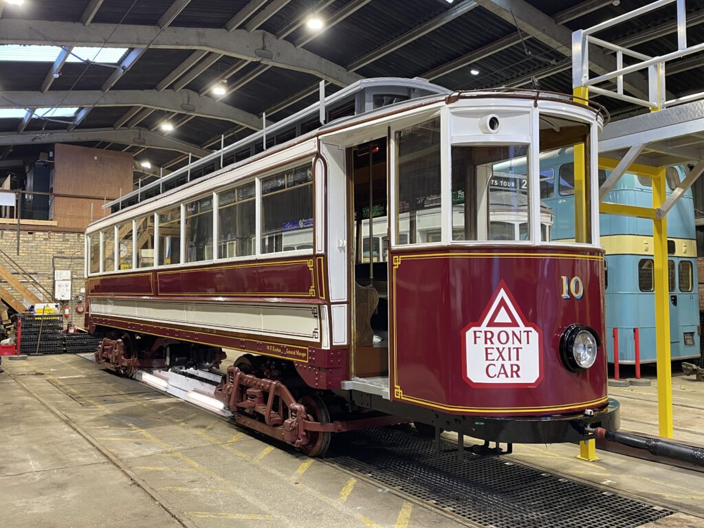 Below: In the first week of the month, Gateshead 10 was shunted from Road 2 onto Road 3 in order to access the inspection pit. This was a first chance to see it in daylight, and also see the side that has been against the wall for the last ten years. Ian and Mick will now continue to reassemble the brakegear components and various overhauled fittings to the underside of the tram.