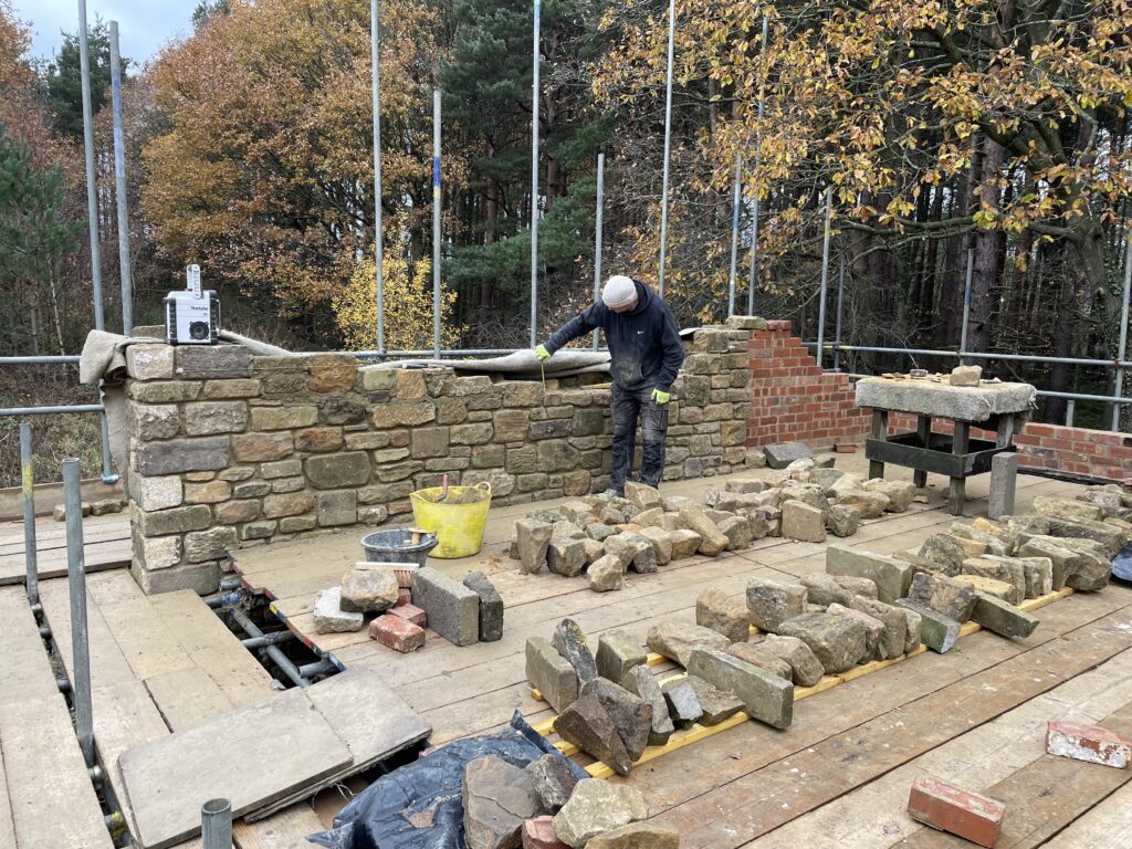 Below: Meanwhile back at Beamish, stone for Samson’s engine shed build is being prepared and some stone-laying has been possible when the weather conditions have allowed. Once all of the walls have been raised to the door lintel height, another scaffold lift will be needed to allow the gables to be constructed.