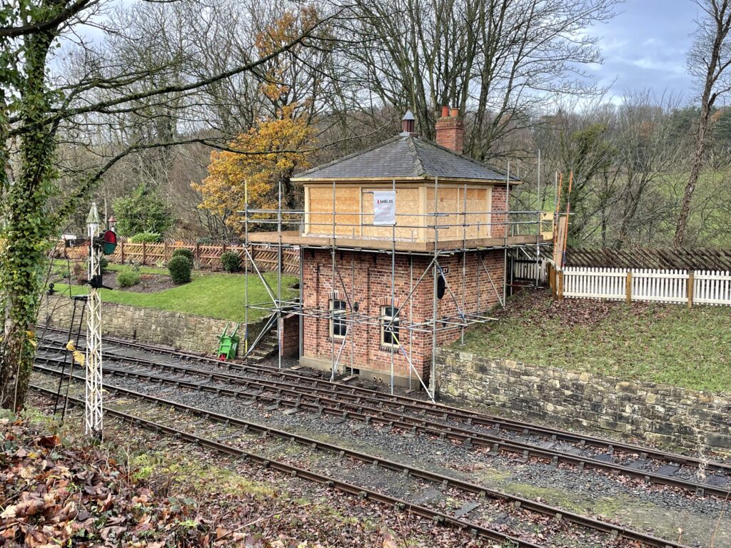 Below: The sliding windows from the signalbox have now been removed for repair/renewal. The effect of the boarded up apertures is rather gloomy, but the result will be worthwhile as this building is something of a focal point for the station and view from the Town.