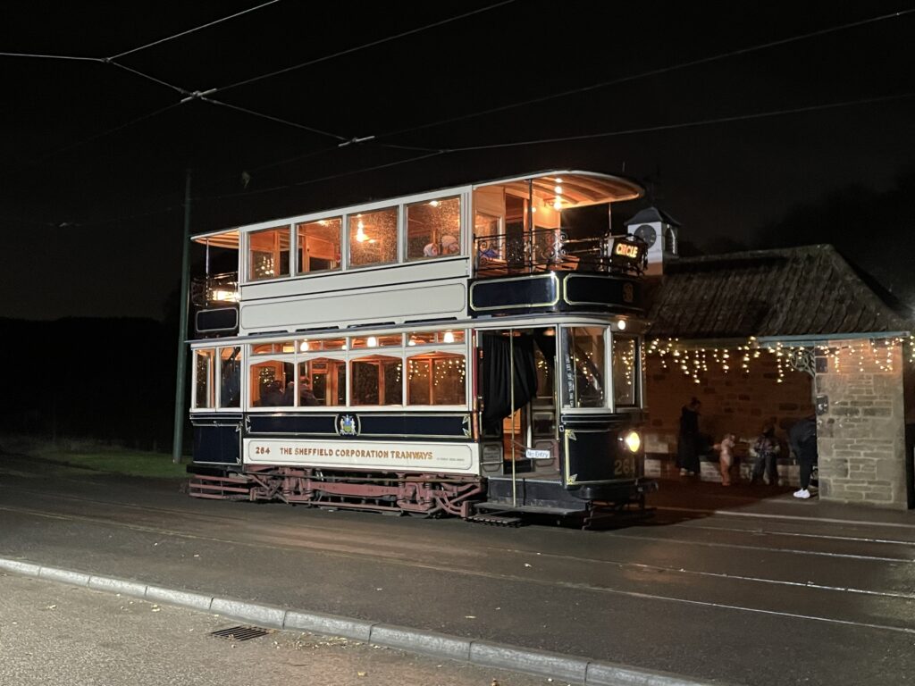 Below: The Christmas evening events are a good opportunity to see the trams and buses operating in the dark, with some interesting flood lighting effects at some locations around the site. This is Sheffield 264 at Pockerley, under powerful artificial lighting.