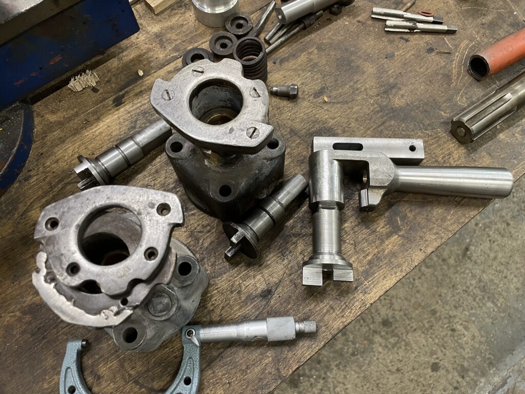 Below: The brake valves for Gateshead 10 have received a great deal of attention over the course of the restoration programme. The two valves are seen here, with one of the removable handles. Of note is the built up (by welding) face on the nearest (lower left), which will be machined true next. This replaces a previous repair on this component, that had not correctly adhered to both contact surfaces of parent metal.