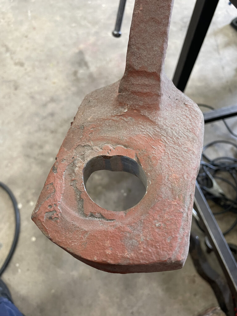 Below: Reflecting on some of the work already carried out on Gateshead 10, here are a few new images of the work carried out on the torque-reaction bars for the motors. They give a good illustration of the process I’ve often referred to as ‘welding up’ on components for this project – so a specific illustration of the process is probably timely. Firstly, we see one of the bars in the raw – clearly the hole has long-ceased to be circular and there is evidence of previous repairs as well as extensive interaction marks with adjacent components.