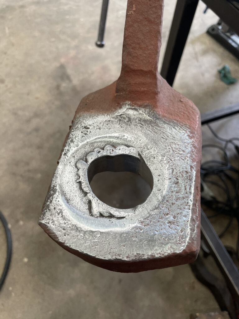 Below: Finally, the weld is dressed off and checked for integrity. The component is then ready for drilling of new (and circular!) holes, and then painting. Chris noted that it would be interesting to track the mileage of MIG wire employed on Gateshead 10 over the years – and this is a good example of just one hole, in dozens as practically every bolt hole on the bogies has had to be simiarly treated.
