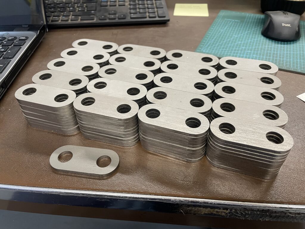 Below: Standard two-hole links were also procured (316 in total) which are paired when assembled into the span wires, again using stainless steel fastenings. Having these laser-cut by an external supplier is considerably cheaper than manufacturing them in-house and makes best use of the team’s time and expertise where it is required.
