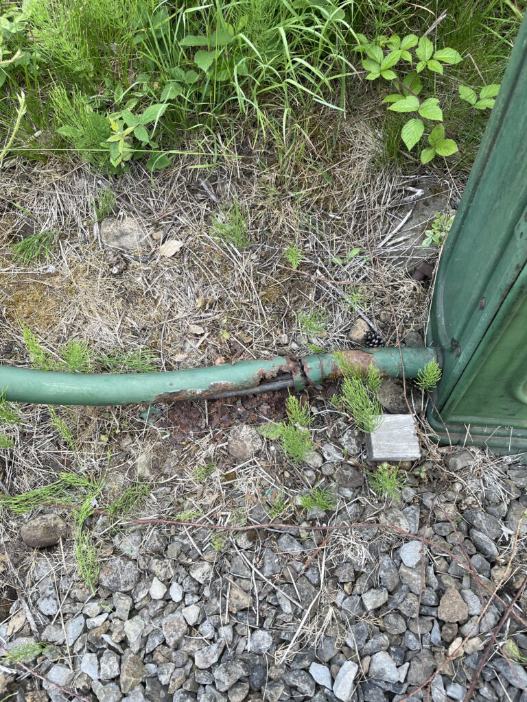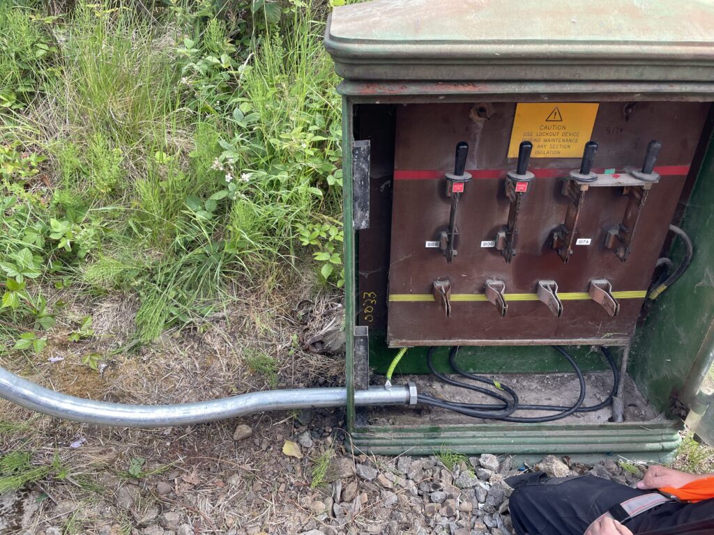 Below: With the old pipe removed, the wires were exposed and also replaced during this process. The interior of the section box can clearly be seen here. This section of line has two wires (both positive) for the Pockerley – Town and Town – Pockerley section (to enable the sub-station trip-gear to see a fault over the distance to this location). Therefore there are two sets of switches in this cabinet.
