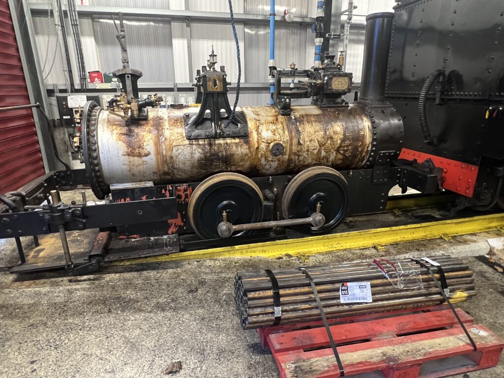 Work is underway on Samson’s retube, which is being carried out by Matt Ellis and some of his colleagues in their spare time at the Ffestiniog & Welsh Highland Railway works at Boston Lodge. Blog readers will recall that Matt was the Keeper of Transport at Beamish for several years before moving to the F&WHR to take on the role of Operations Manager. He has sent some detailed reports back on progress, so I’ll hand over to Matt for the update on Samson: