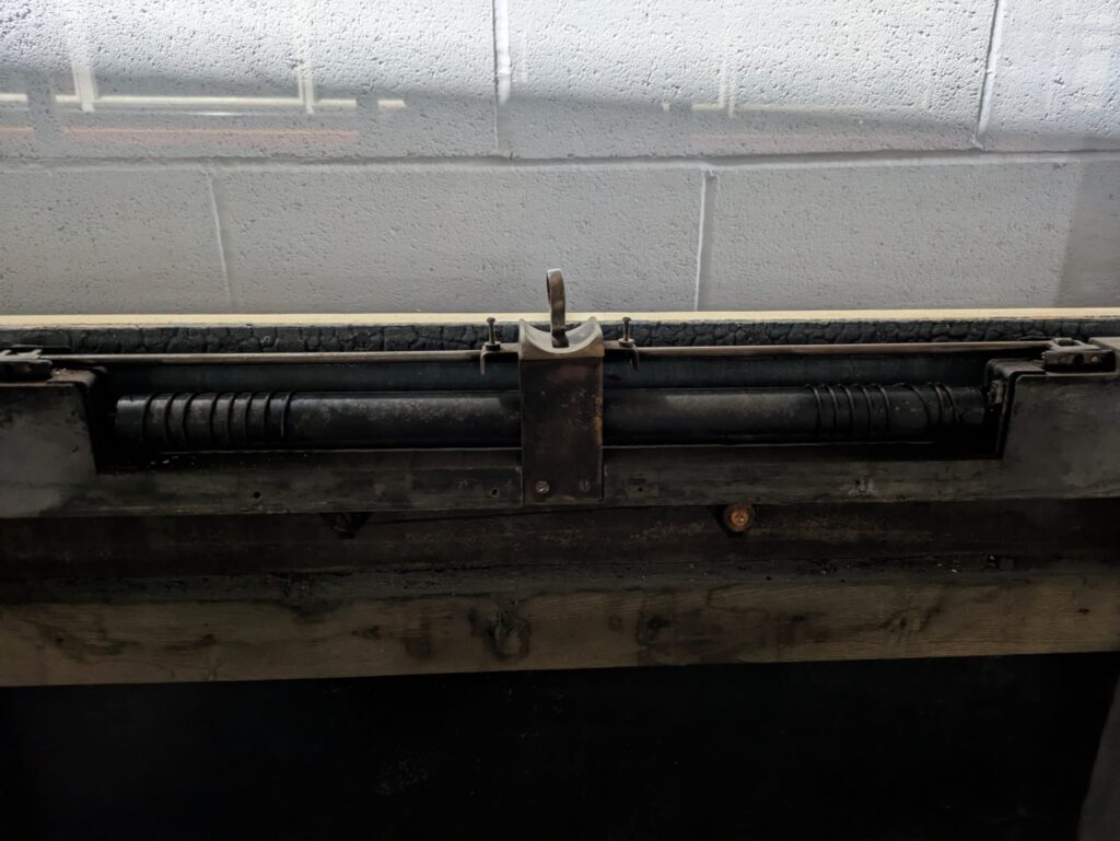 Below: One of the original mechanisms on the bus – the cylinder can clearly be seen, around which is wrapped a cable at each end to the window itself. The catch in the centre of the view secures the window in whatever position is desired. The torsion of the springs within the cylinder positively hold the window in position, anywhere between fully closed and fully open. The action in use is a very smooth one and one that is pleasingly ‘interactive’ for passengers.