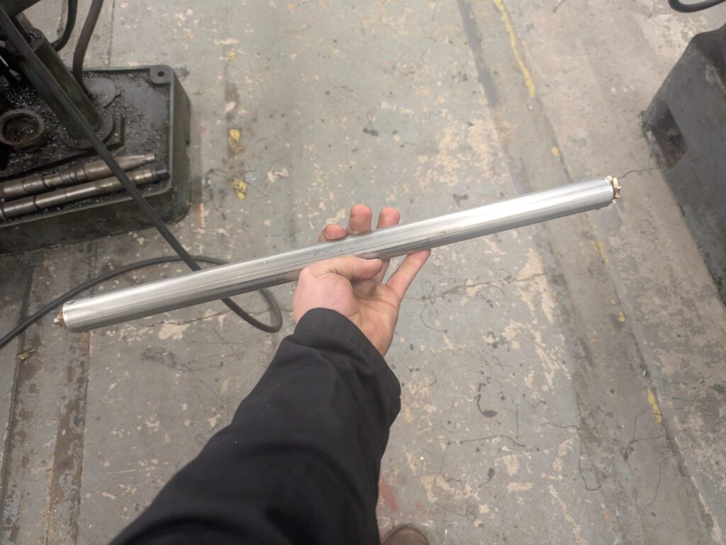 The mechanism consists of two springs, one inside the other, contained within a cylinder and with a shaft through the centre. This is all held captive using end-caps, one of which is seen here after Sam had manufactured a set of them. The principle is identical to the up-and-over garage door mechanisms that many readers will be familiar with.