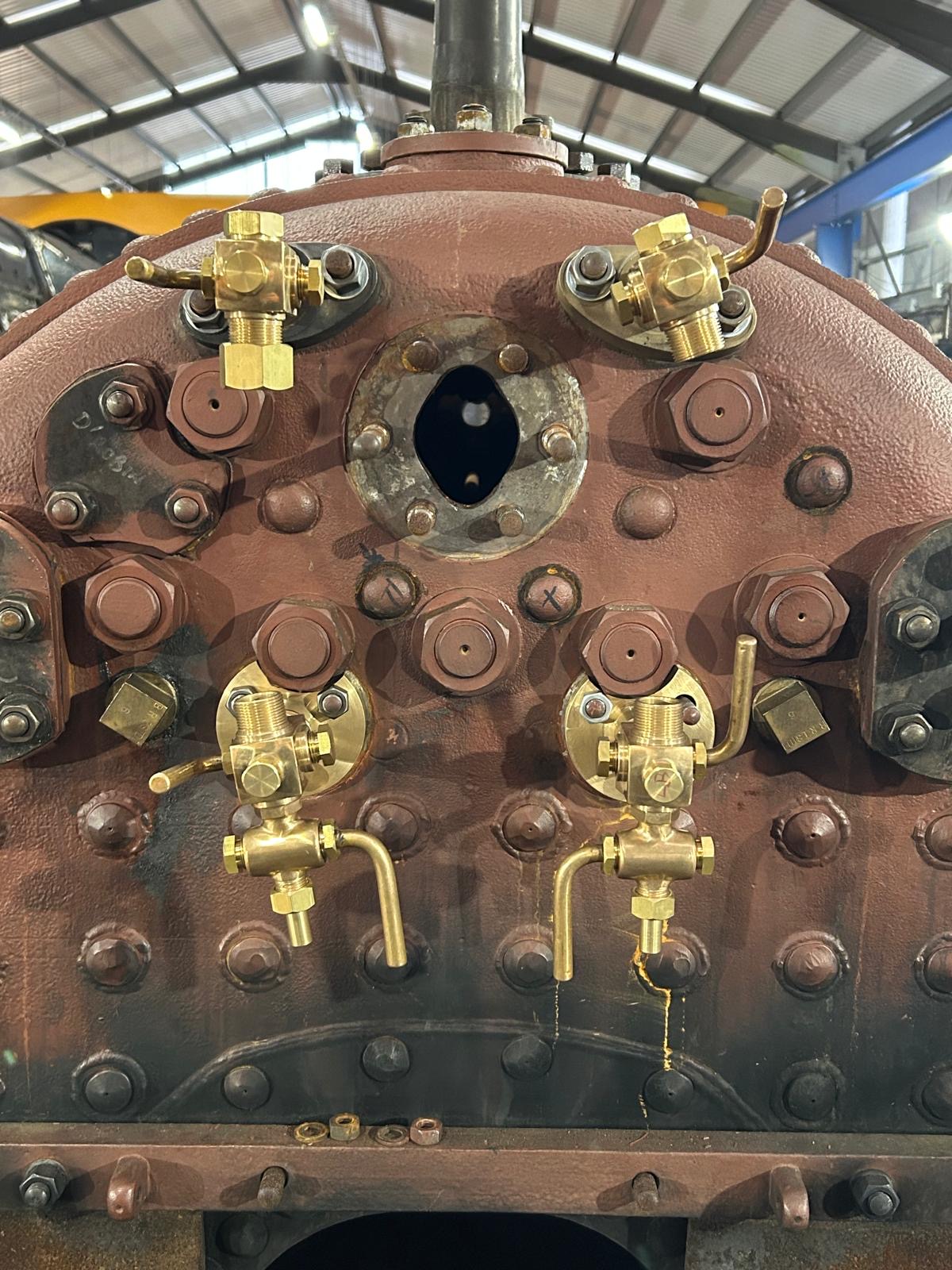 Below: All of the water gauge fittings are being replaced, and as seen in a previous post, these are being adapted for the very specific fit required on Dunrobin’s backhad – flanges having to accomodate longitudinal stay nuts (lower) and the radius of the backhead (upper).