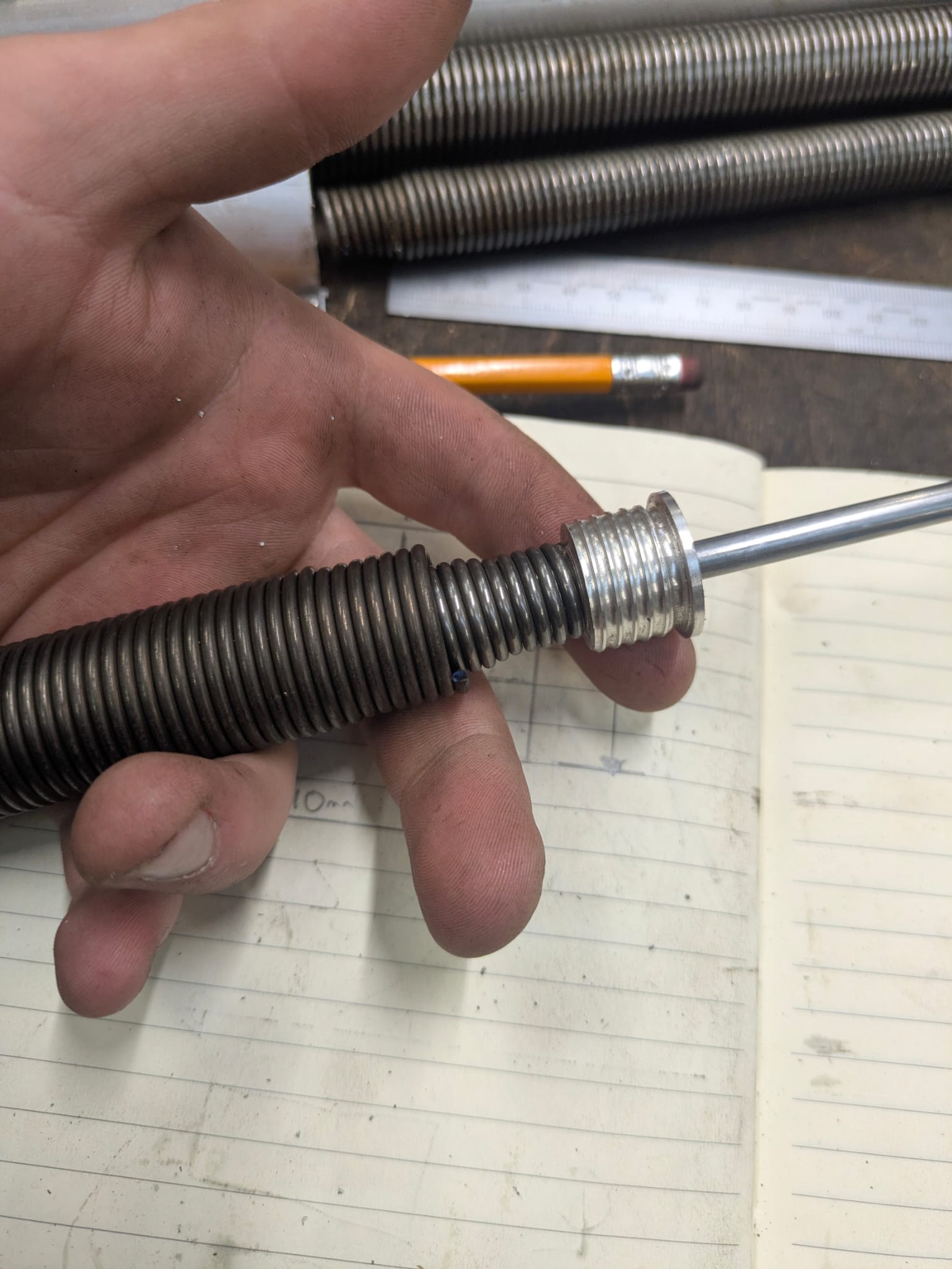 The mechanism consists of two springs, one inside the other, contained within a cylinder and with a shaft through the centre. This is all held captive using end-caps, one of which is seen here after Sam had manufactured a set of them. The principle is identical to the up-and-over garage door mechanisms that many readers will be familiar with.