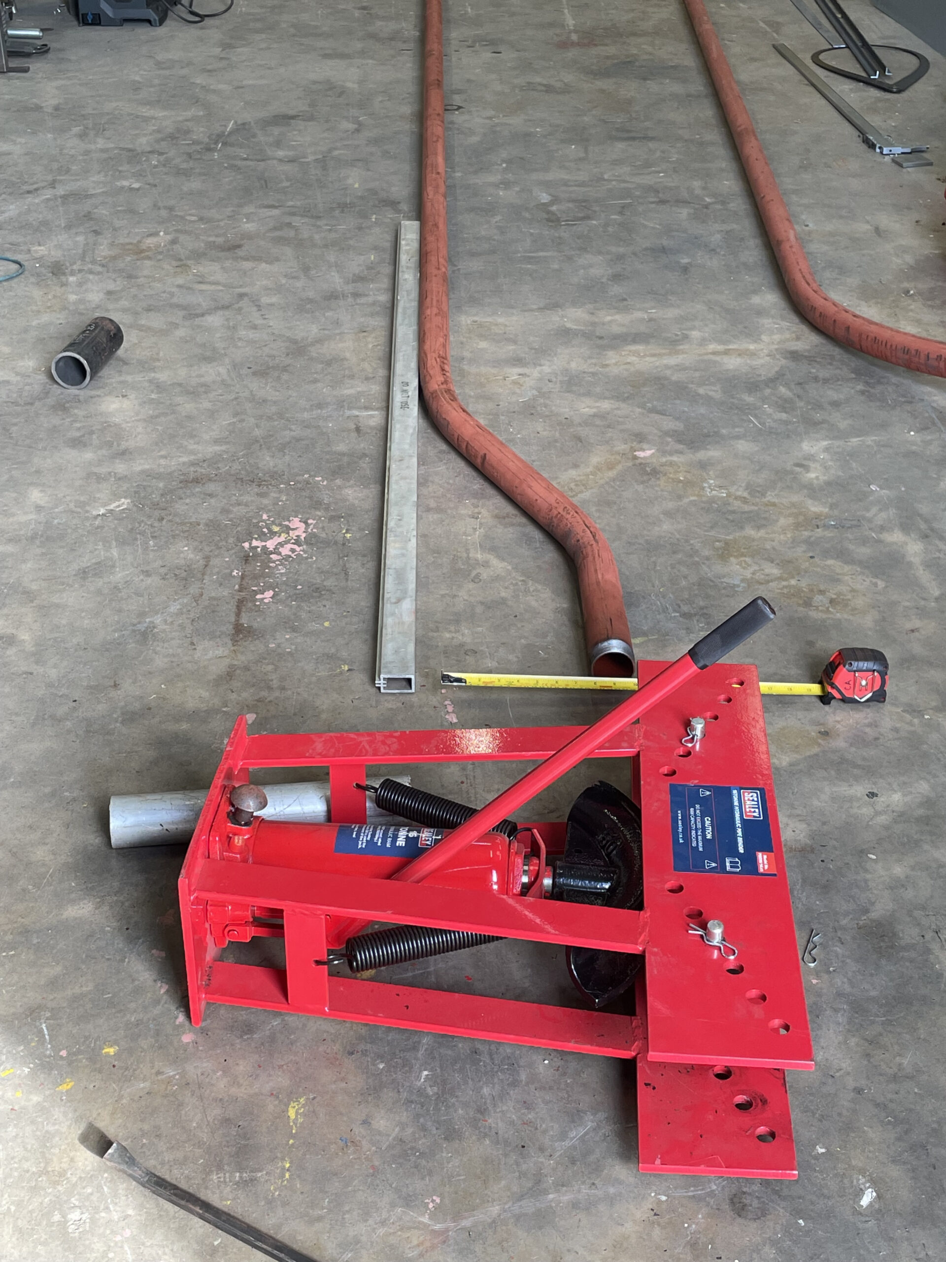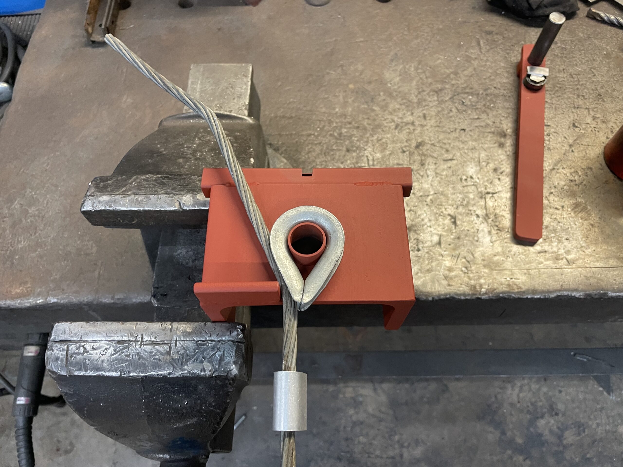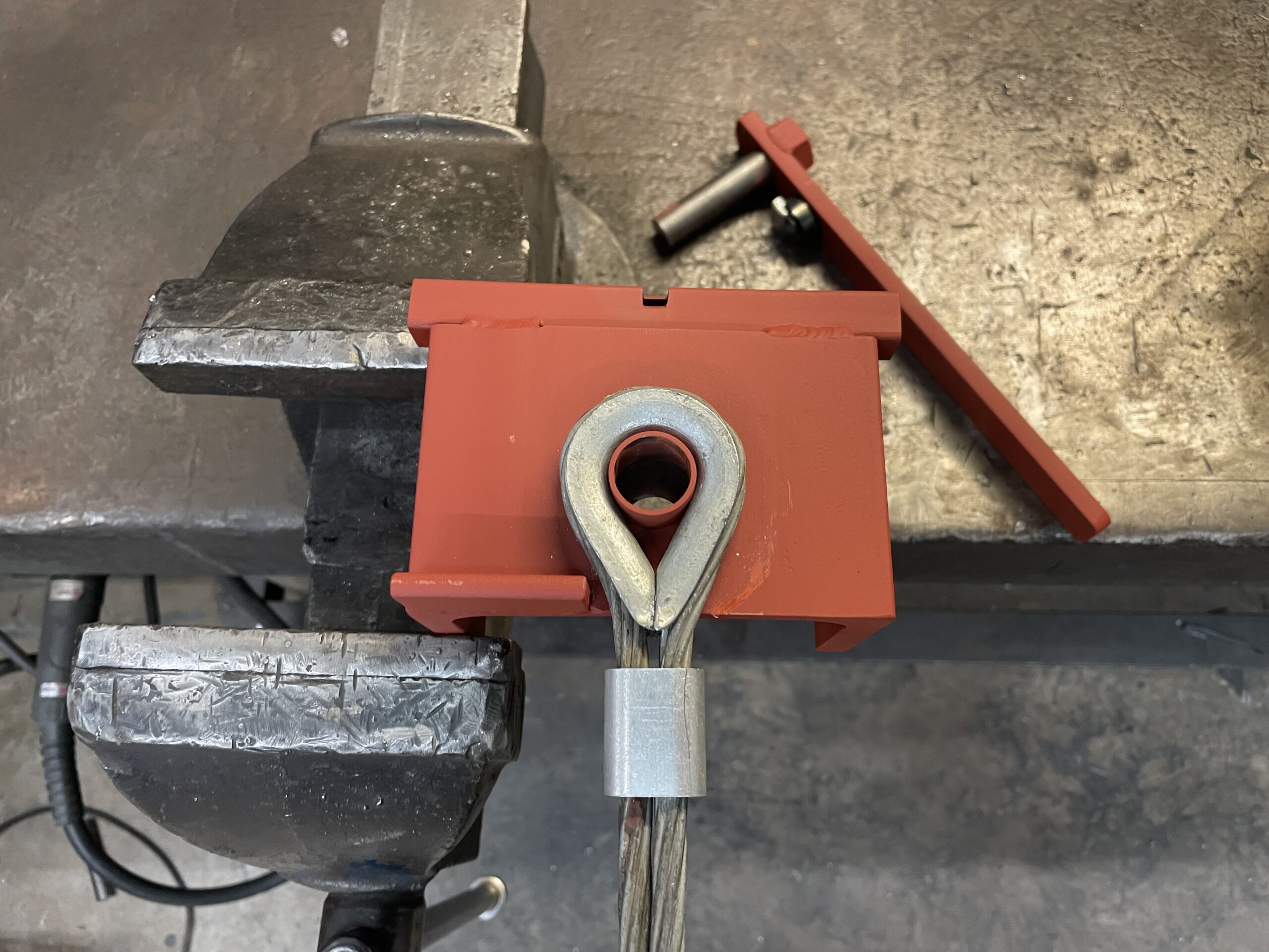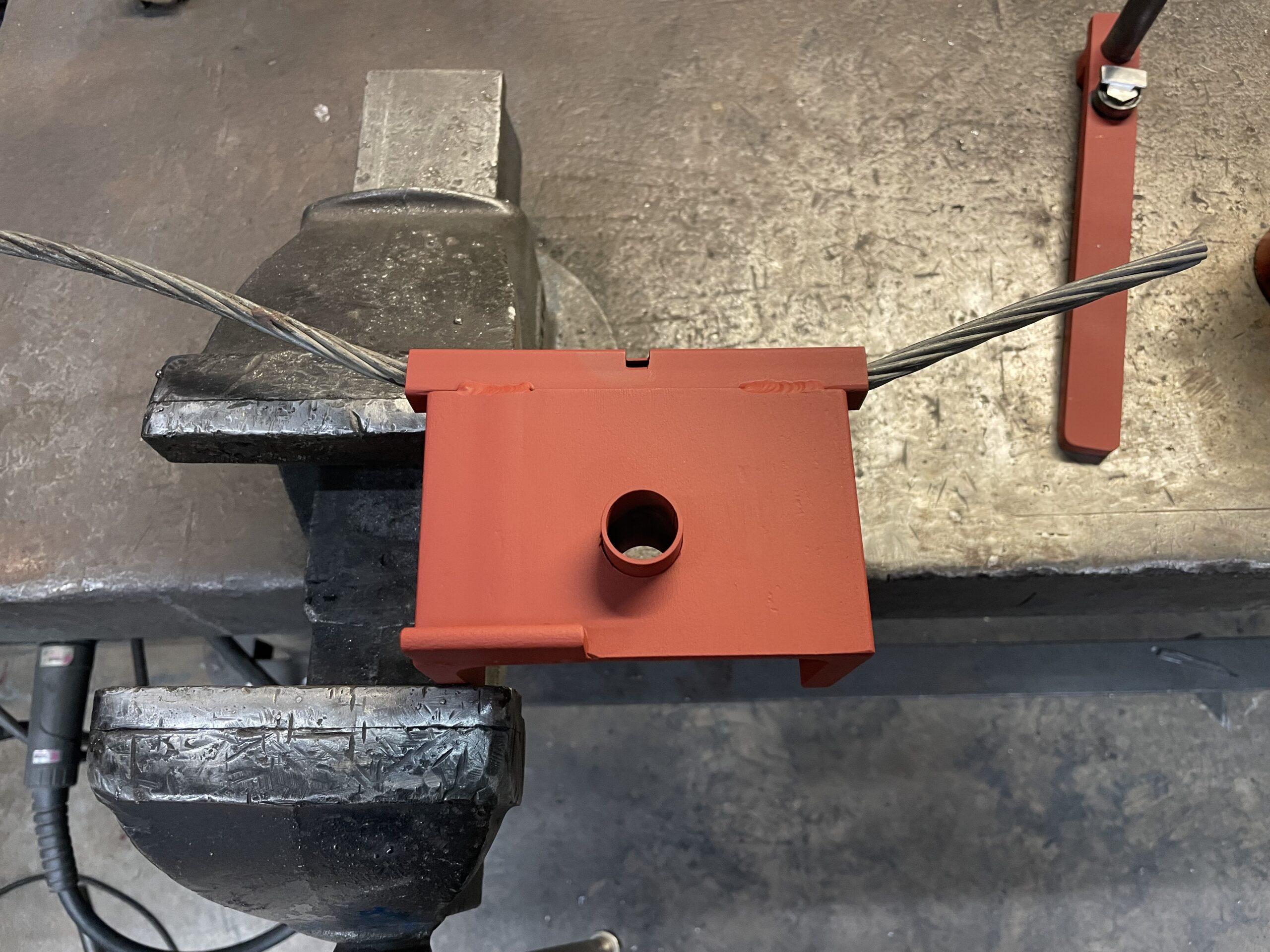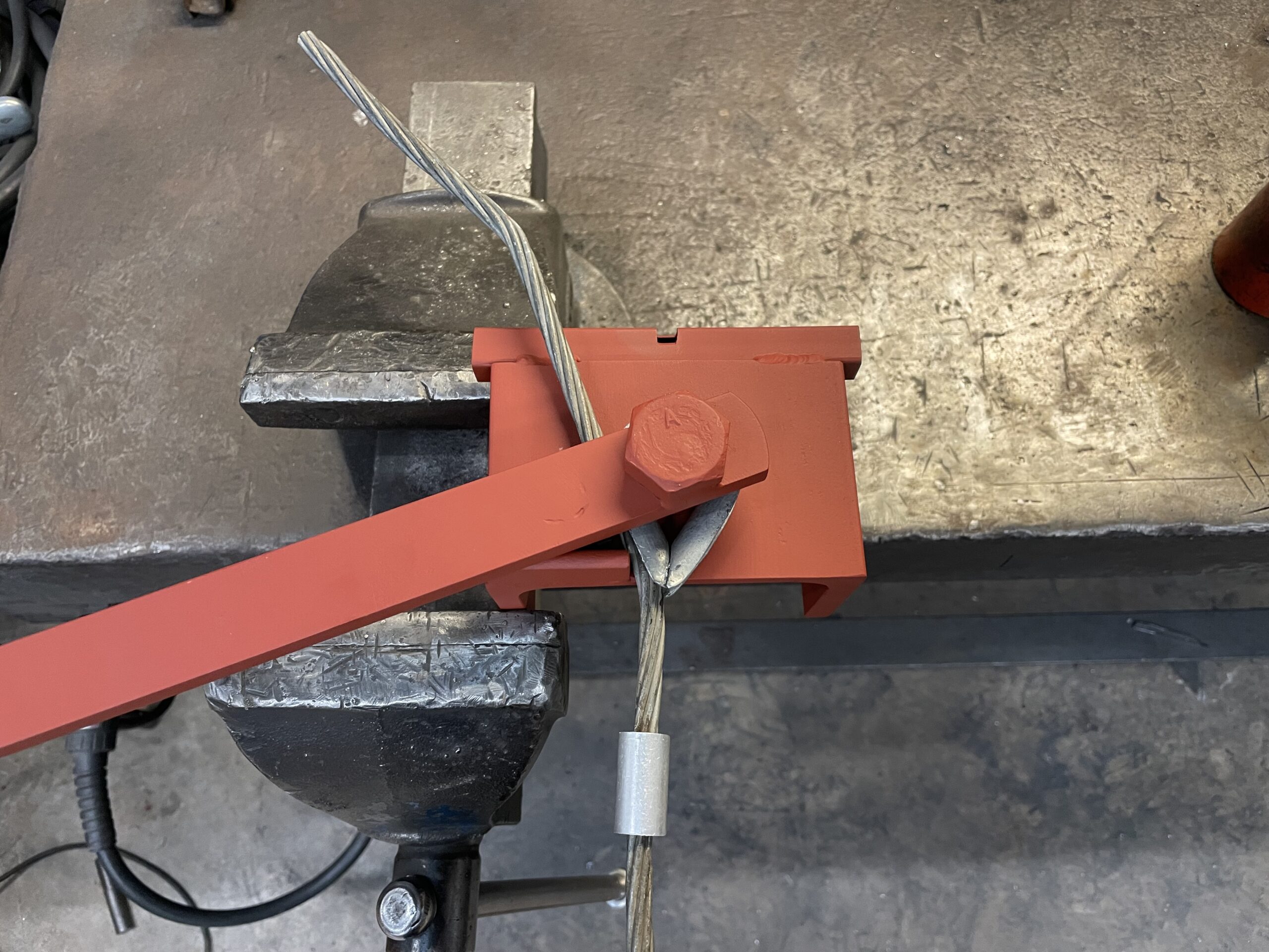 This photo shows the spanwire inserted into a square tube that is attached to the jig. This then allows two pre-bending operations to be carried out.