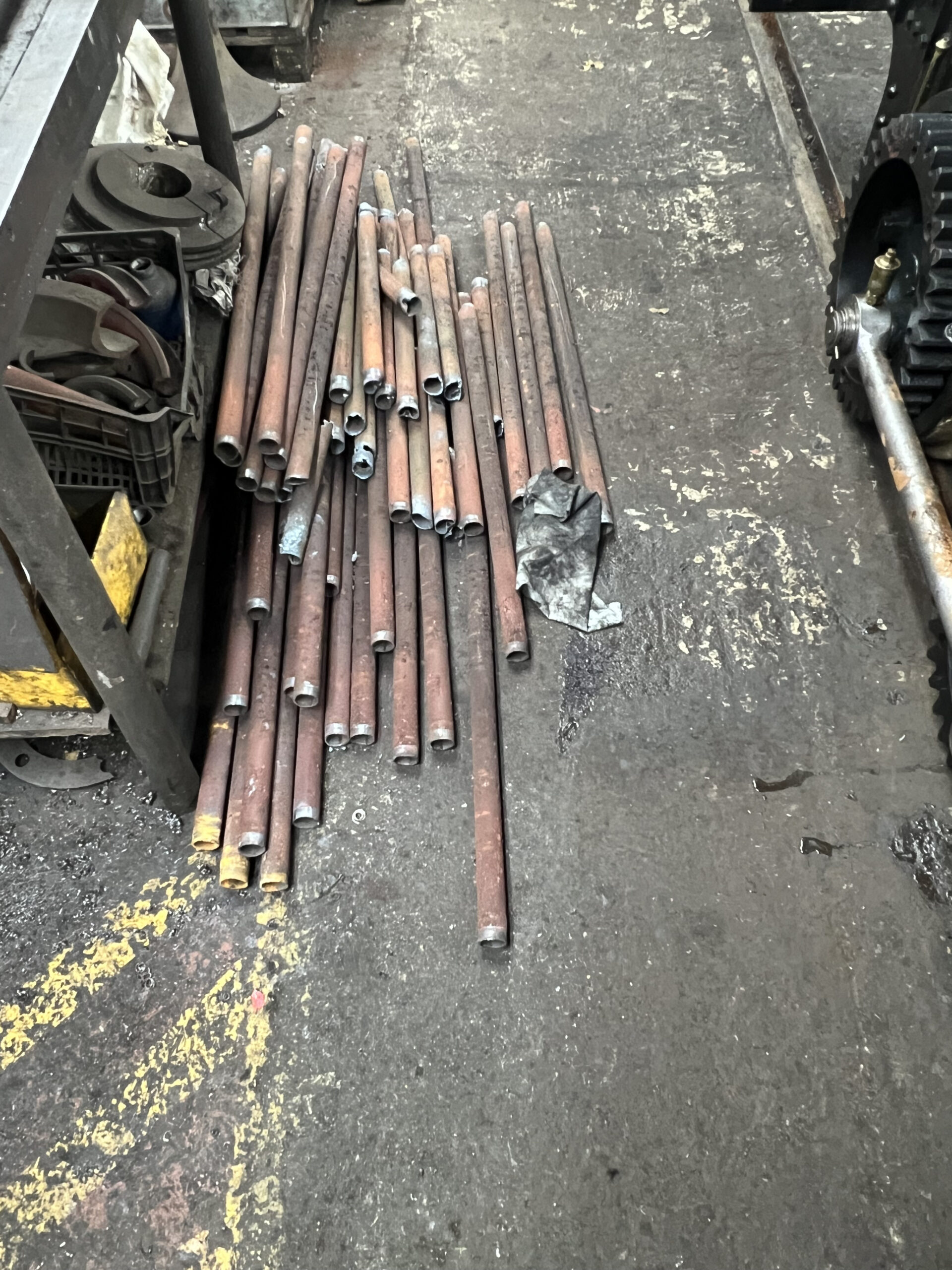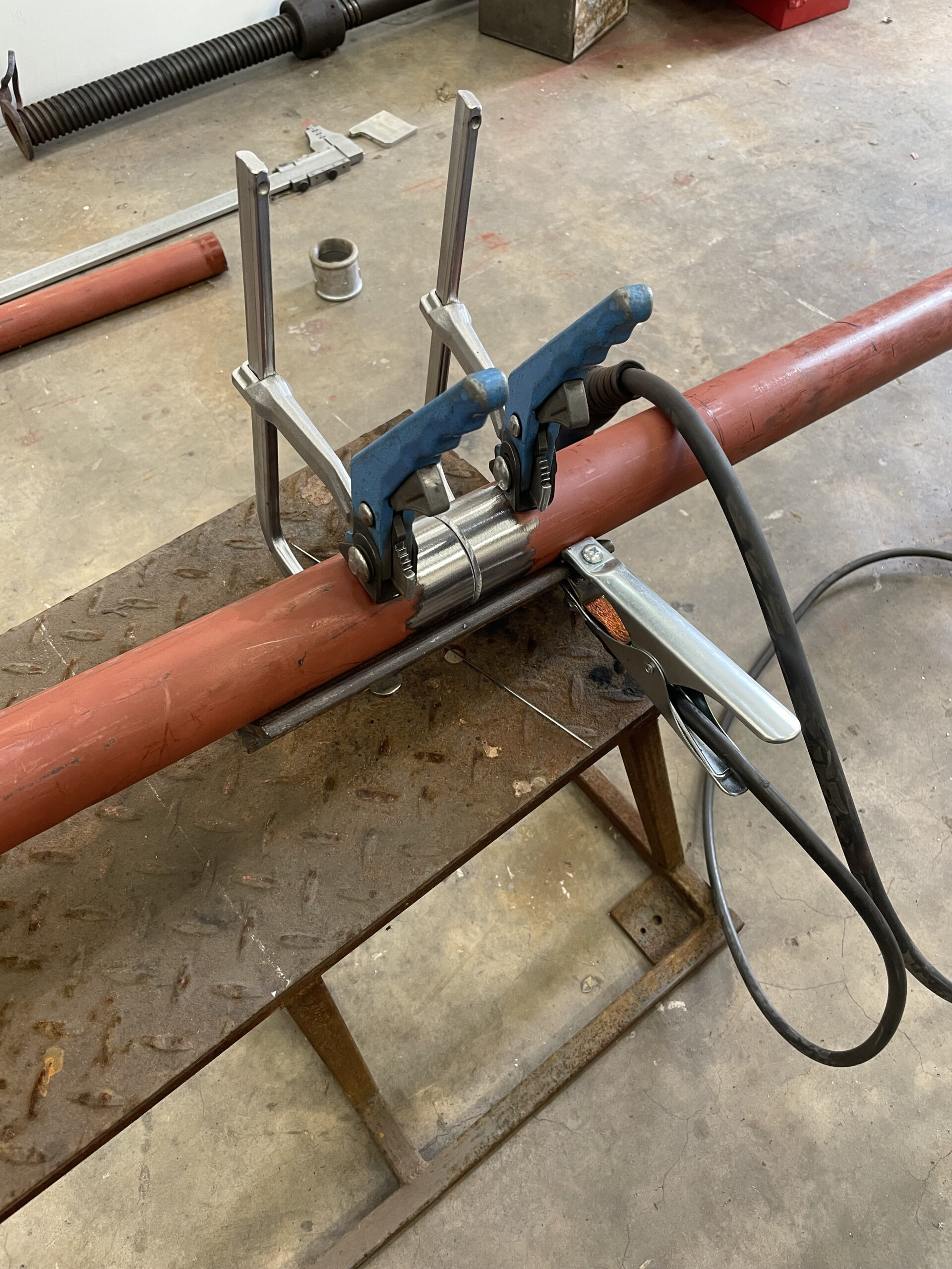 Below: Tube removal – the method of extraction was to grind the firebox end flush with the tube plate. This end is 1/16″ smaller in diameter than the front, but the section that protrudes into the firebox would damage the tube plate if dragged through it. The tube ends were then heated to orange, thus expanding them within the constraint of the tube hole. When they cool, they are then loose in the tube plate. A puller is then used to draw the tubes forwards and with the firebox end being smaller, out through the front tube plate. The first three were extracted with this method, but took a long time and a great deal of effort. It also required the puller to be rebuilt for every tube.