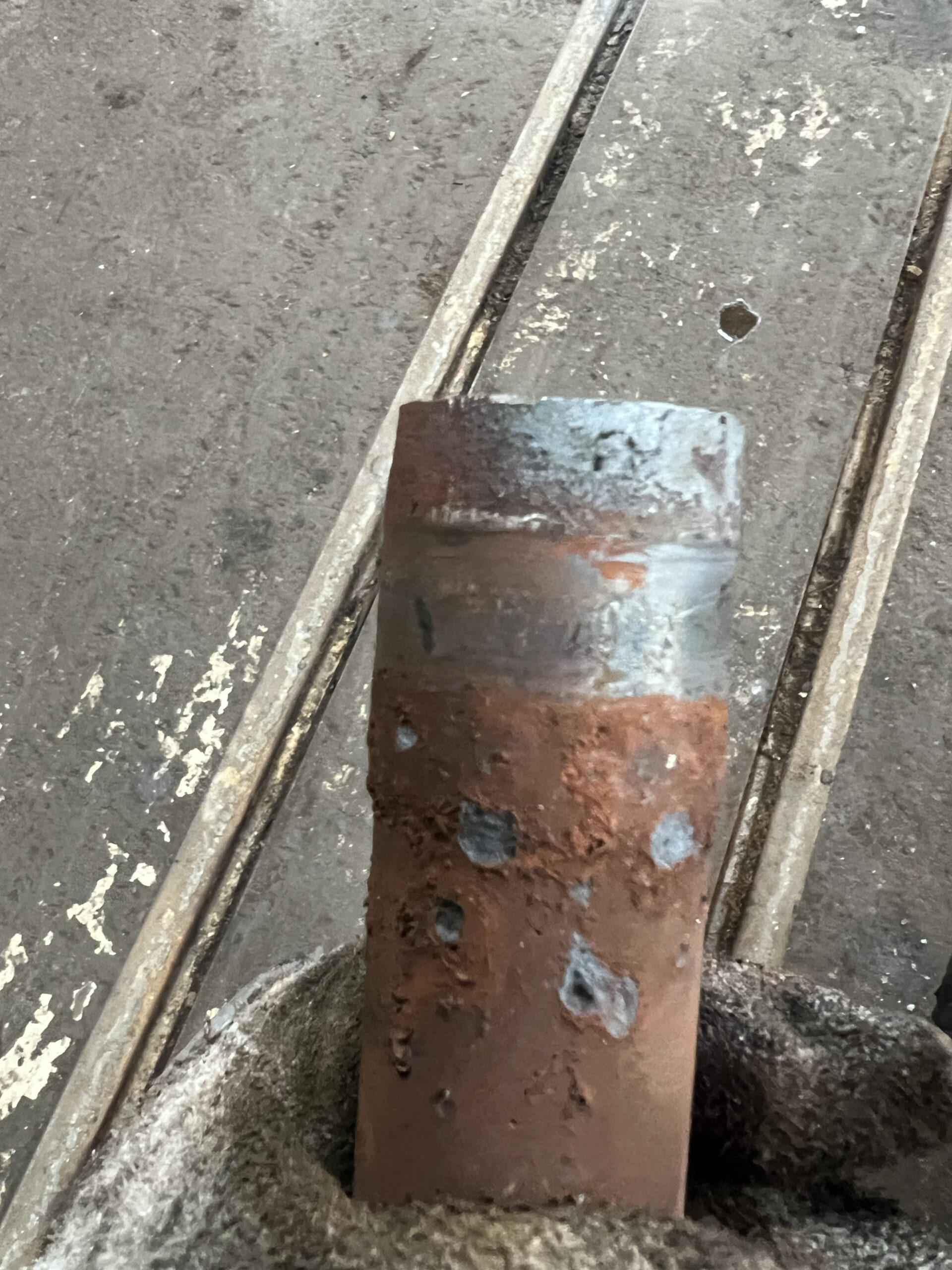 Below: This view shows the expansion described above – the section of expended tube shouldn’t protrude into the water space, indicated here by the red rust section of tube, but it clearly has bellied out – and this made extraction through the tube holes very difficult. Whence method 2 being adopted for removal.