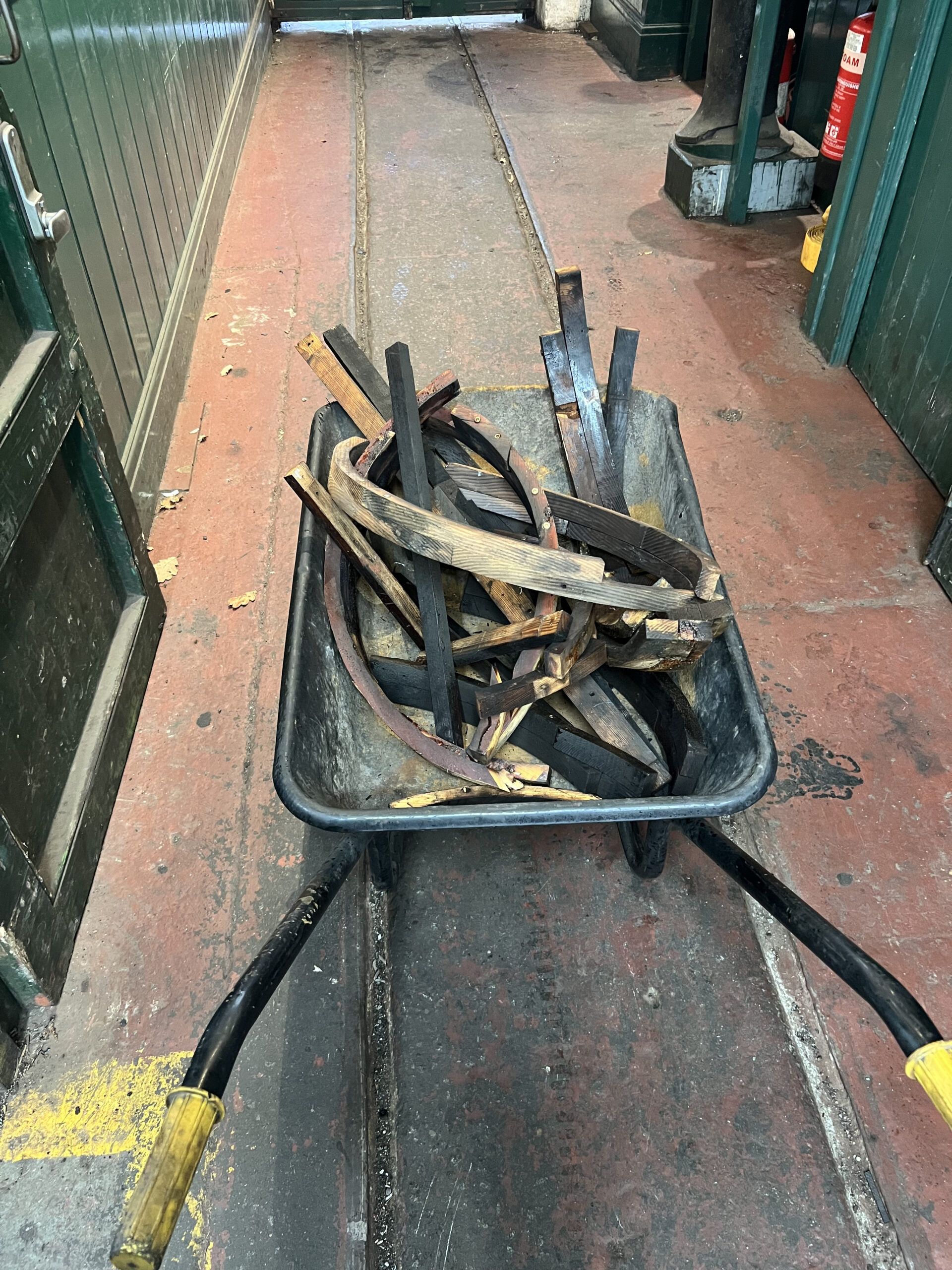 Below: After another session of dismantling – this is the barrow full of wooden cladding spacers after removal. These cannot be re-used so new wooden lagging will be made when the boiler is reassembled.