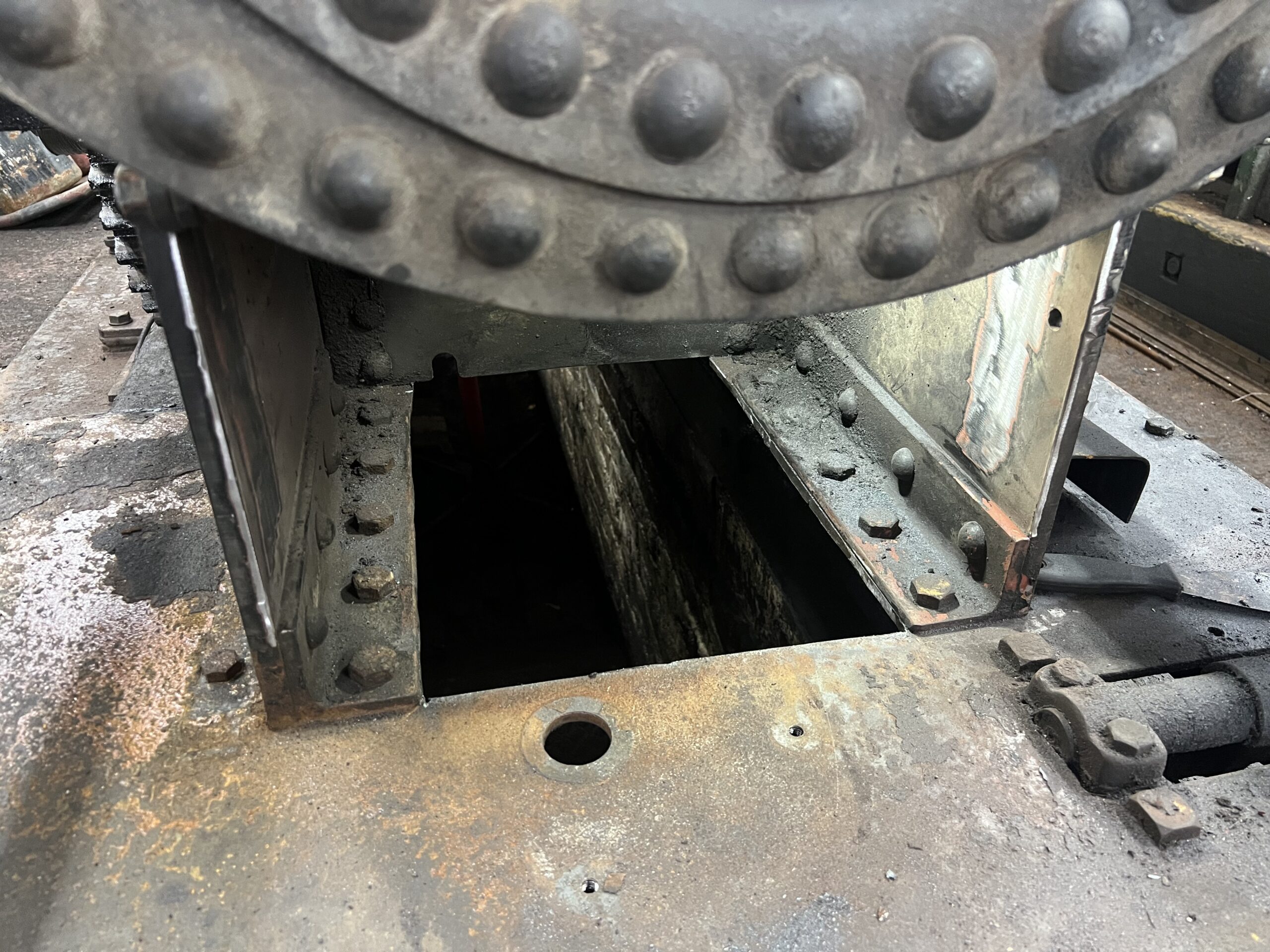 Below: The dome cover has been removed to expose the J pipe (and allow its removal) – this being the component upon which the regulator acts to control the flow of steam from the boiler (at its driest point within the dome) to the cylinders (via the main steam pipe, sometimes known as ‘dry pipe’ within the boiler vessel itself). There was some evidence of leaking in the new J pipe casting during hydraulic testing, so a repair or replacement option is being explored to rectify this.