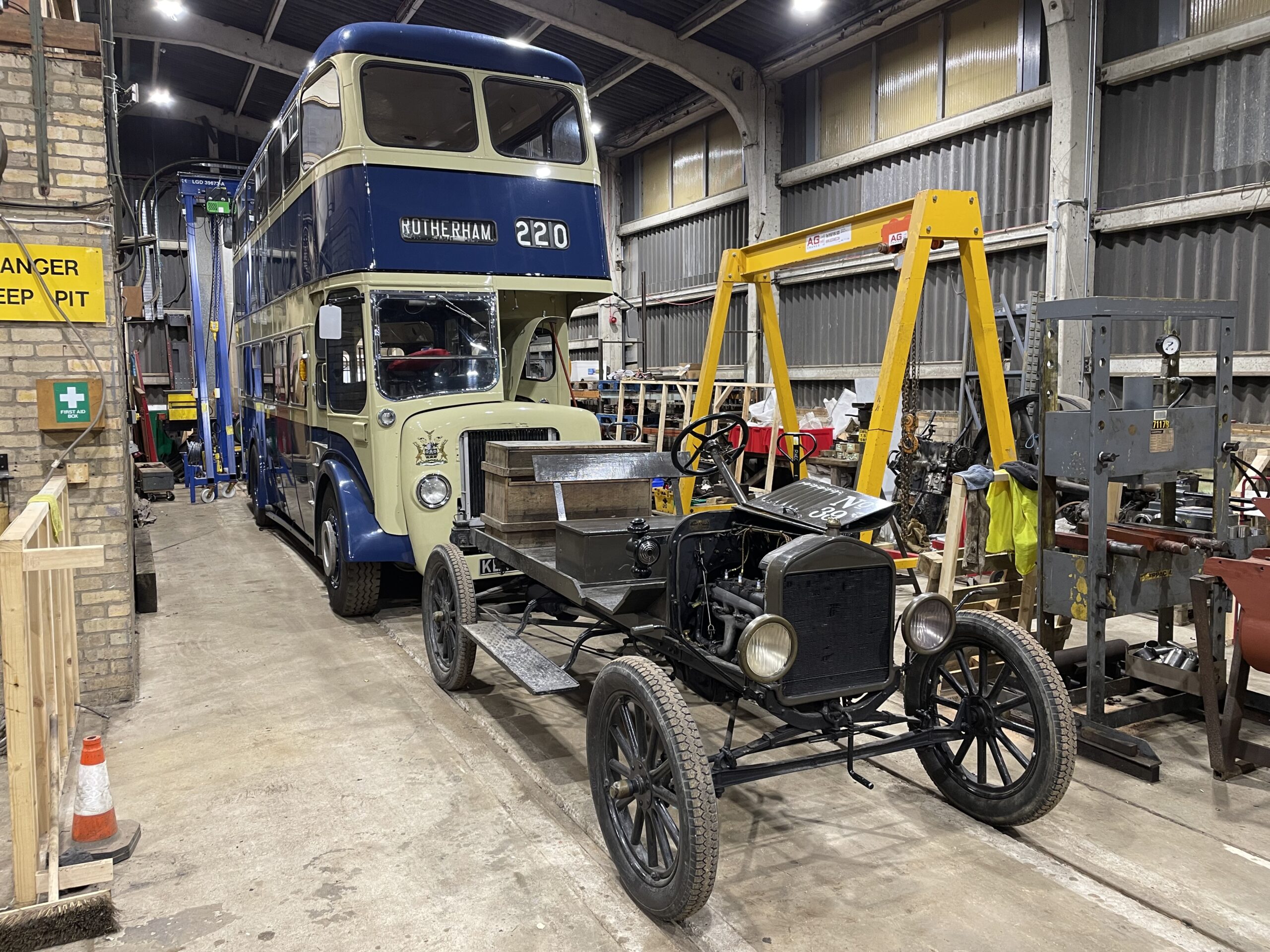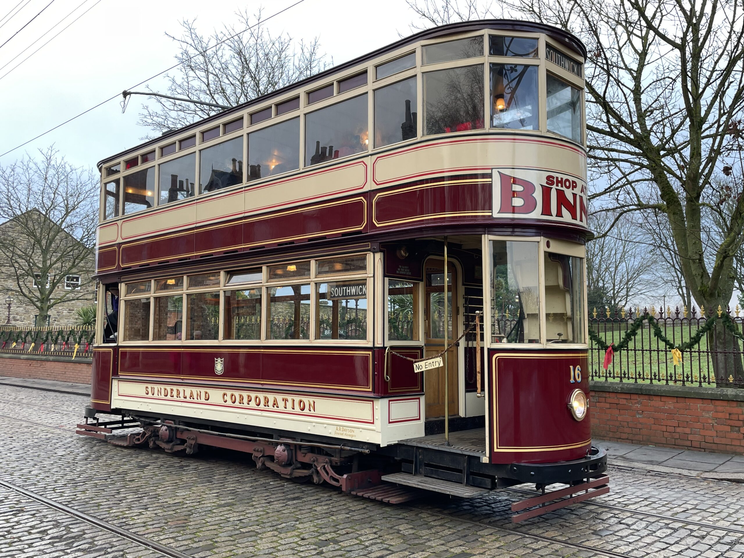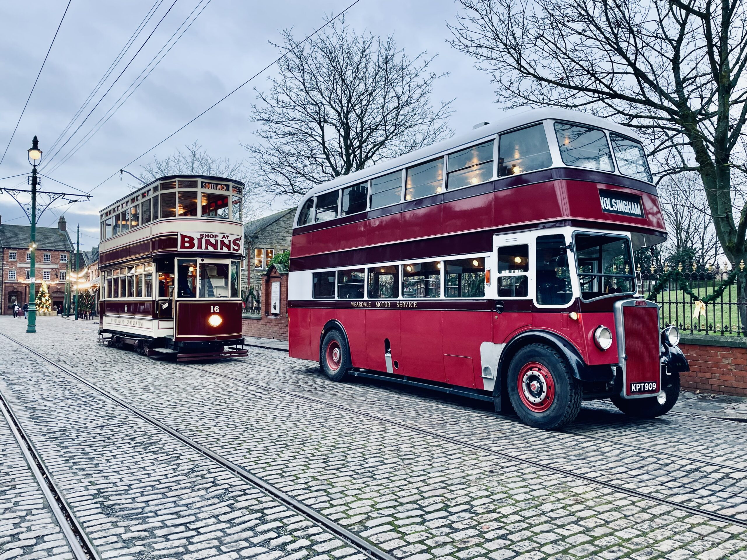 Below: The familiar winter operation sight – Sheffield 264, Sunderland 16 and the B-Type bus. Blackpool 31 and Oporto 196 have also been out (the latter being a popular driver-training tramcar). KPT 909, the Scouts Leyland and Crossville 716 have provided an all-Leyland bus service on weekdays too – the engine in the B-Type replica is a Leyland 401 diesel engine, so after a fashion this counts too!