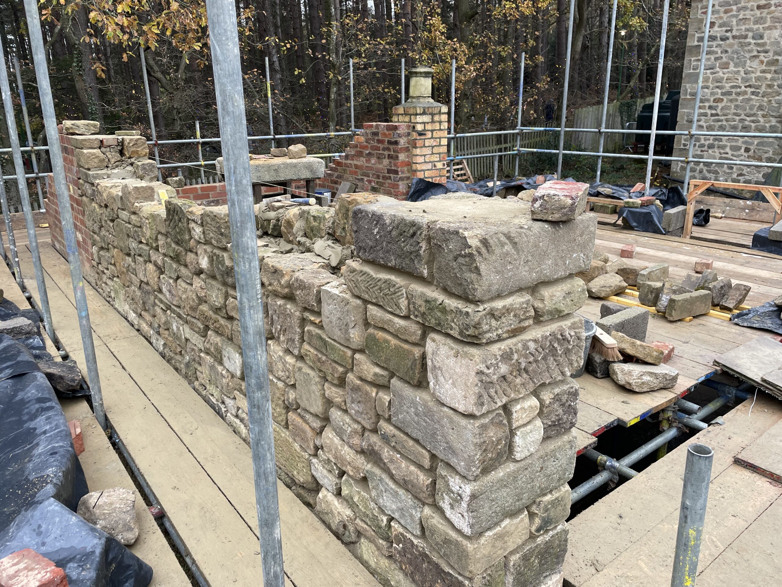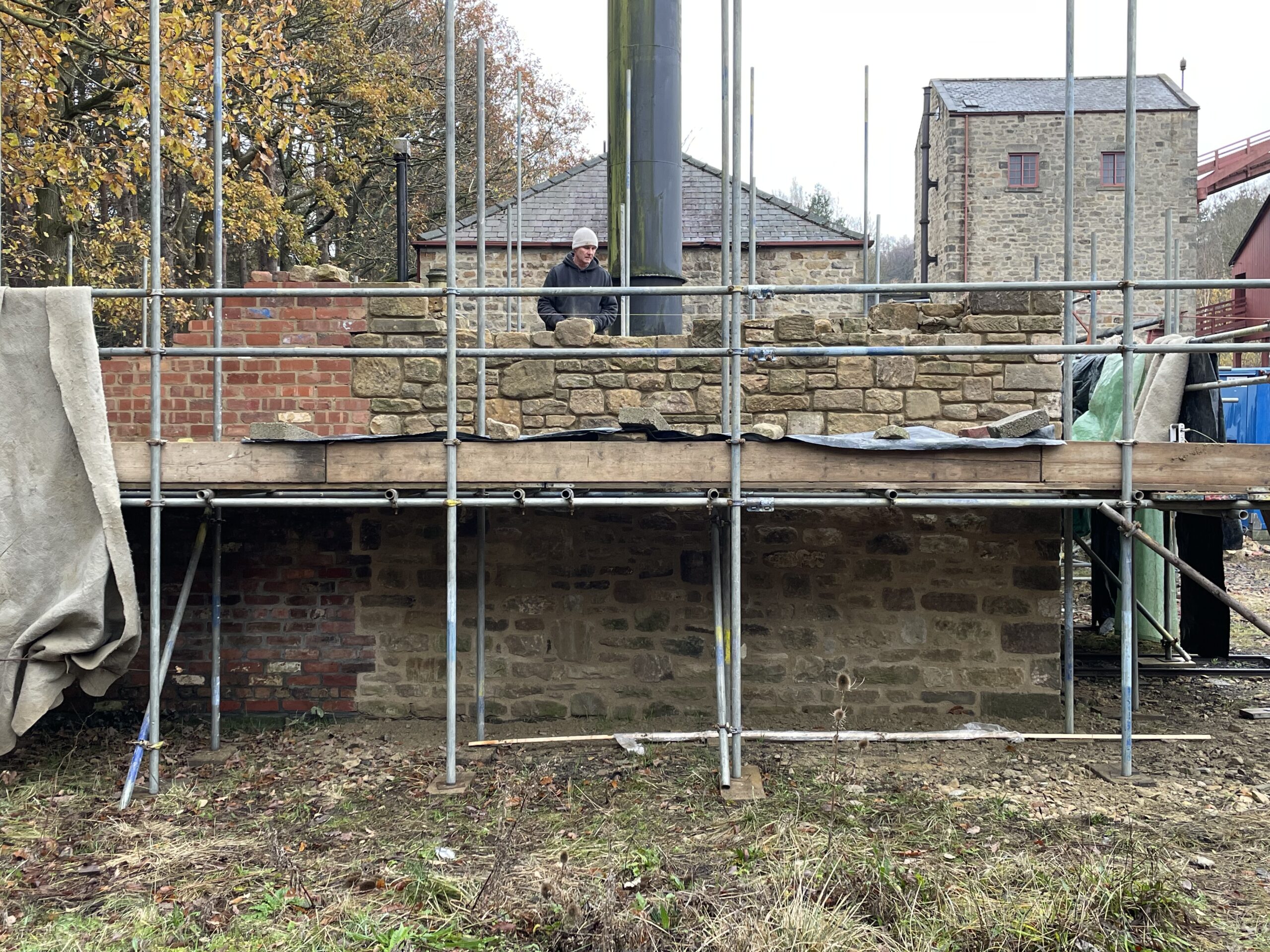 Below: Meanwhile back at Beamish, stone for Samson’s engine shed build is being prepared and some stone-laying has been possible when the weather conditions have allowed. Once all of the walls have been raised to the door lintel height, another scaffold lift will be needed to allow the gables to be constructed.