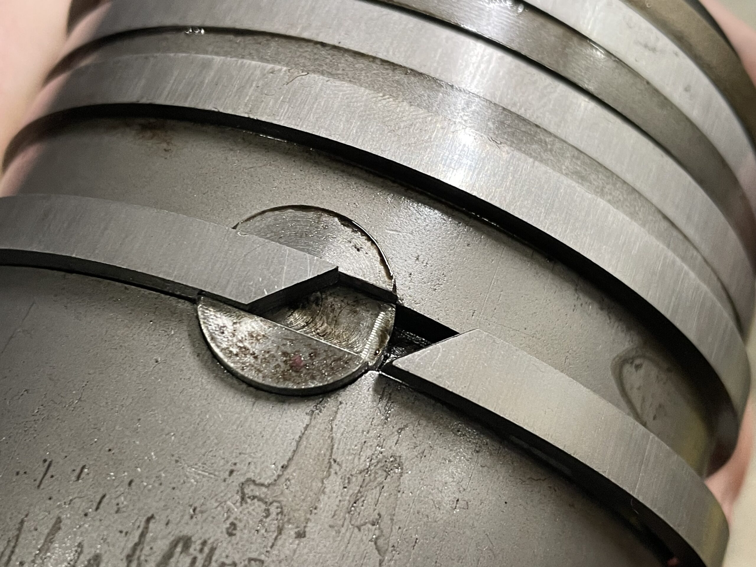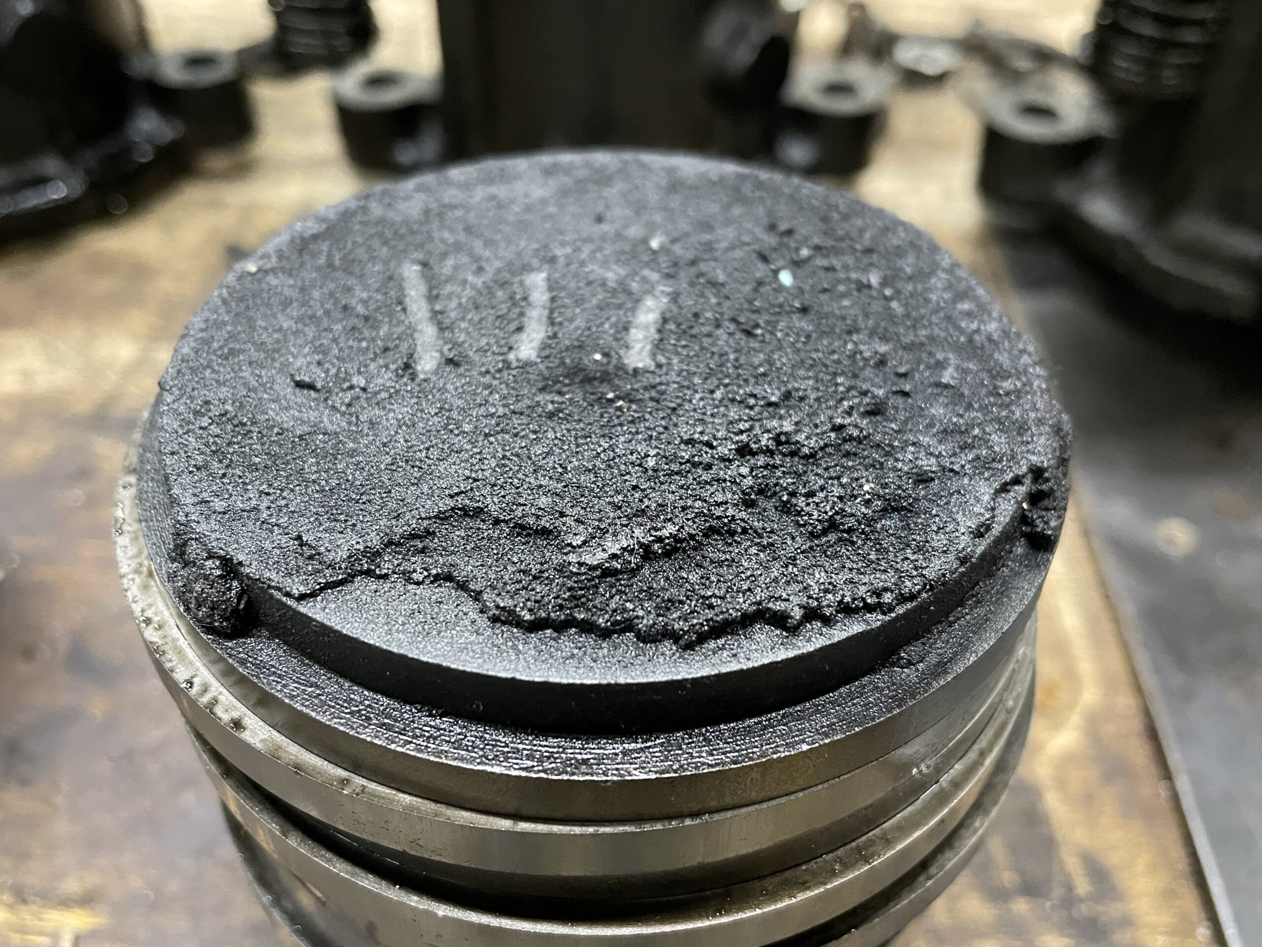 Below: One of the pistons, showing the amount of carbon that had built up on the crown. The new pistons will be machined for fitting the rings at Beamish, in order to take a standard sized ring and include an oil control ring.