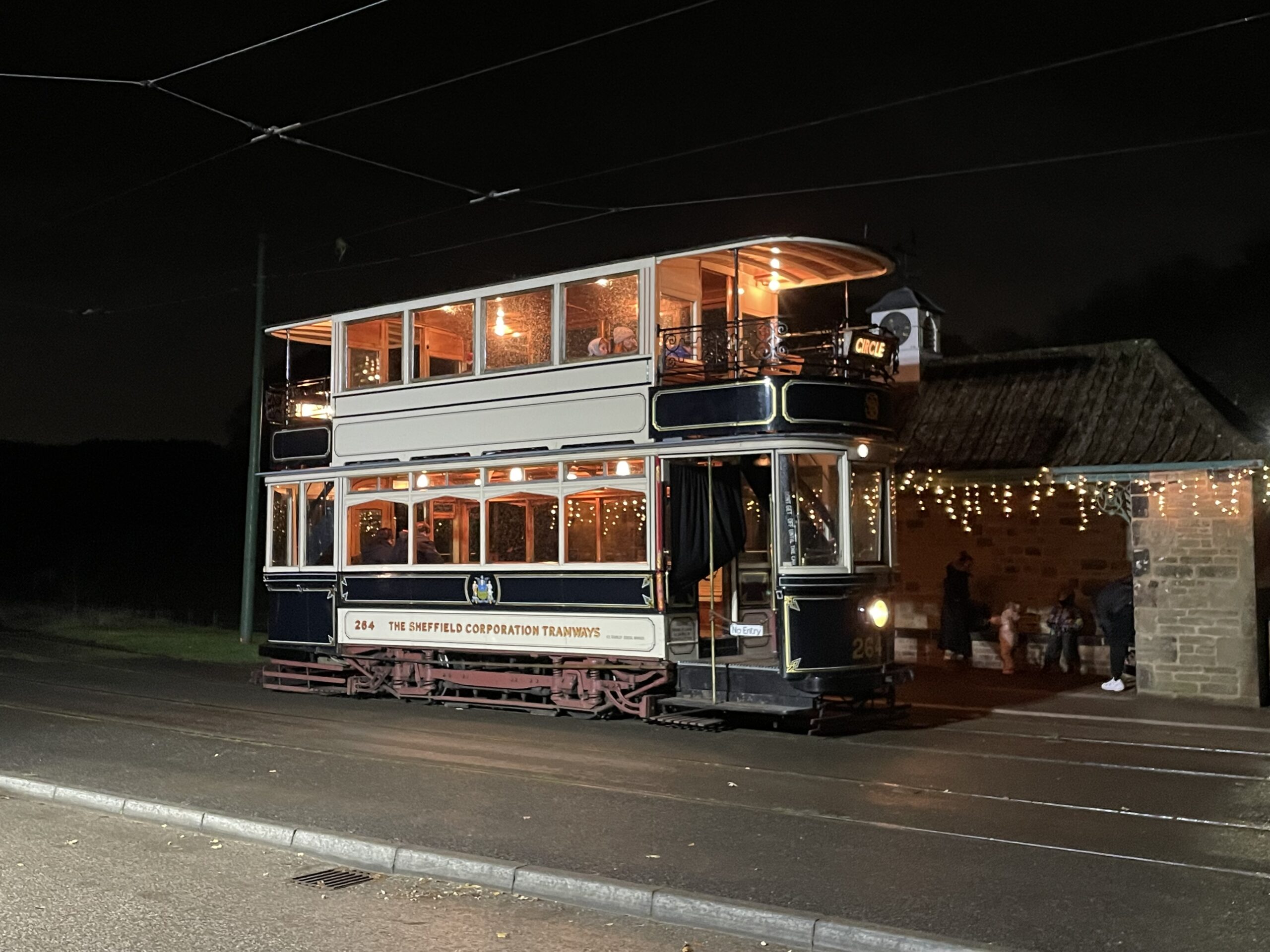 Below: The Christmas evening events are a good opportunity to see the trams and buses operating in the dark, with some interesting flood lighting effects at some locations around the site. This is Sheffield 264 at Pockerley, under powerful artificial lighting.