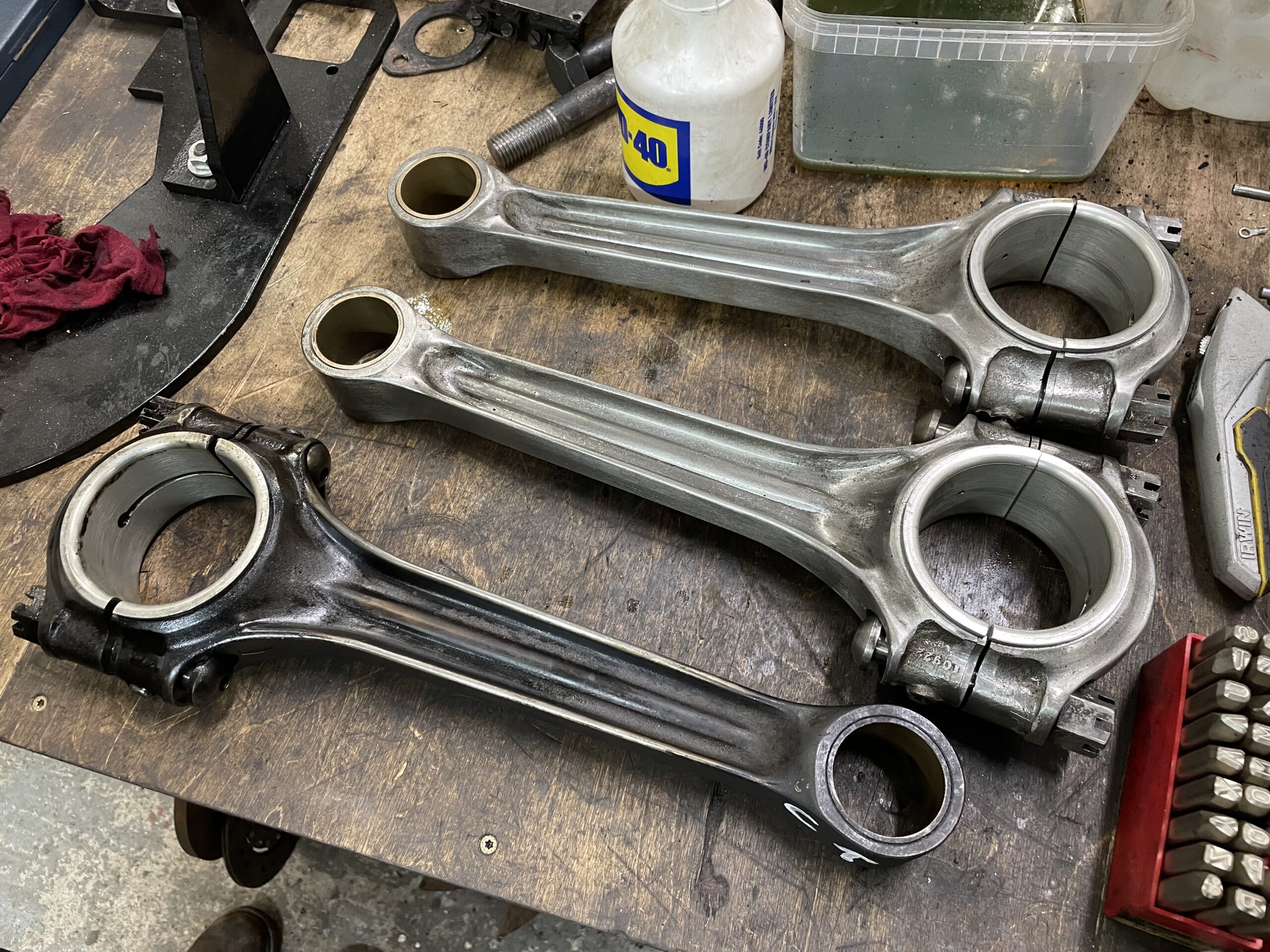 Below: Some of the connecting rods for the engine – note the very high quality of finish on these components which were being marked up with their positions within the engine at the time of this photograph.