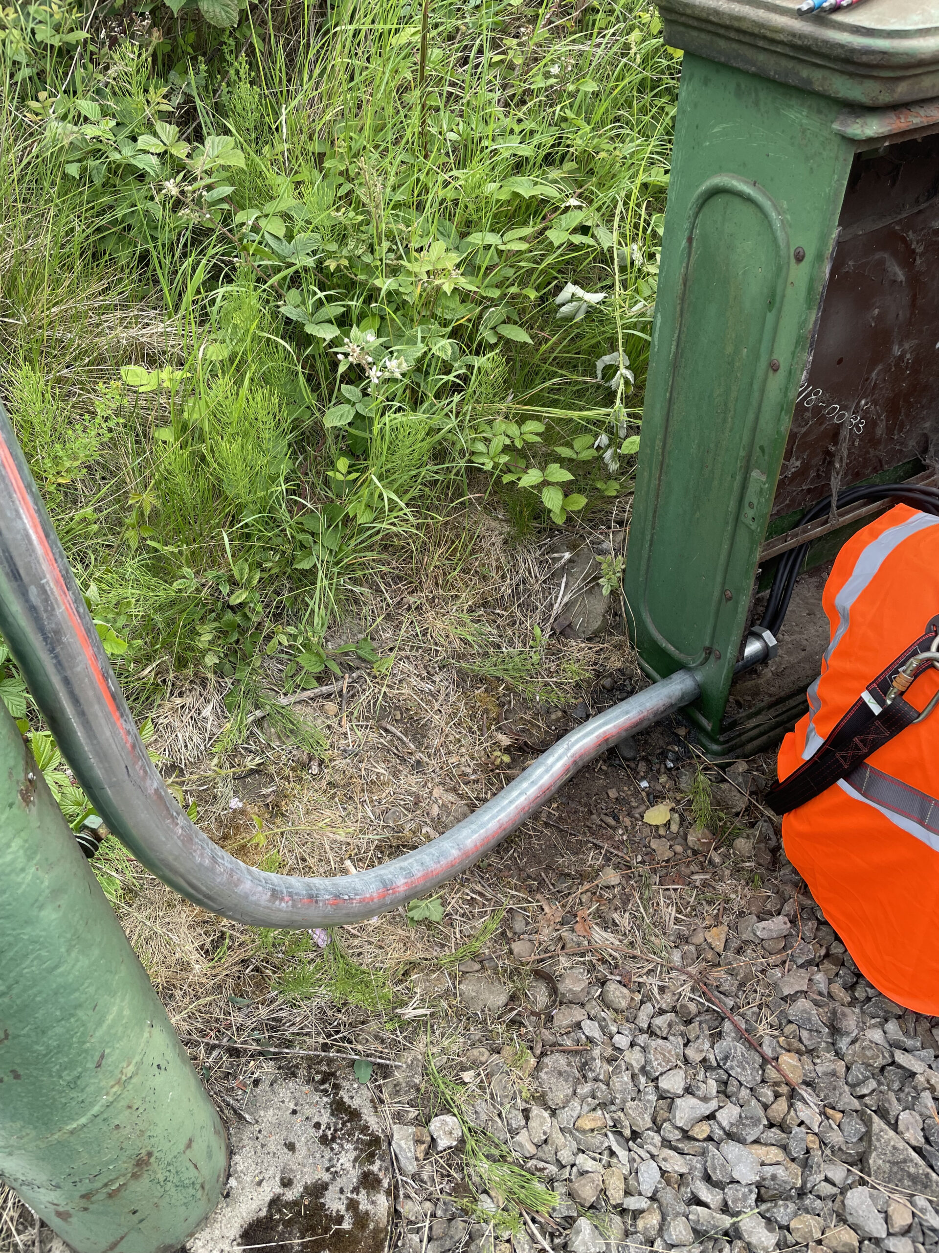 Below: Another job on the OLE was replacement of the pipe within which the cables run down from the overhead at the Section Insulator (SI) in the vicinity of the Welfare Hall. The cables run to a section box, within which is the mechanism that allows for sections of the tramway to be isolated at a local level, and retain other sections in a live condition for continued operation. The pipe within which these cables run, and are protected, had corroded badly at the point of entry to the section box, and so required renewal.