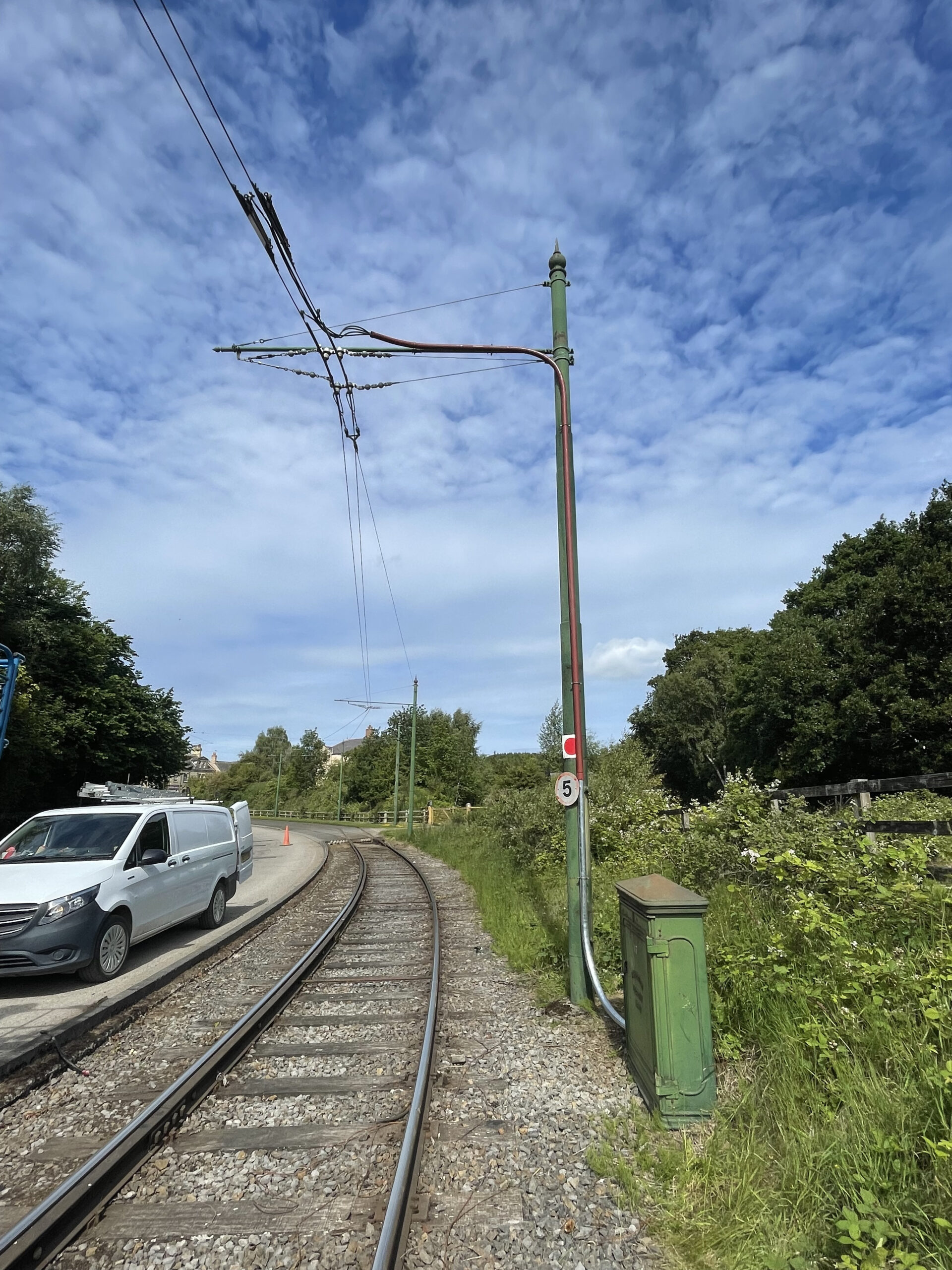 Below: The completed work – note the Section Insulators that are inserted into the contact wires, the two contact wires (both positive) and therefore the ability to be able to isolate sections of the Tramway whilst keeping other sections live. A plan for some traction pole painting is being formulated as some of the poles are in need of cosmetic treatment.