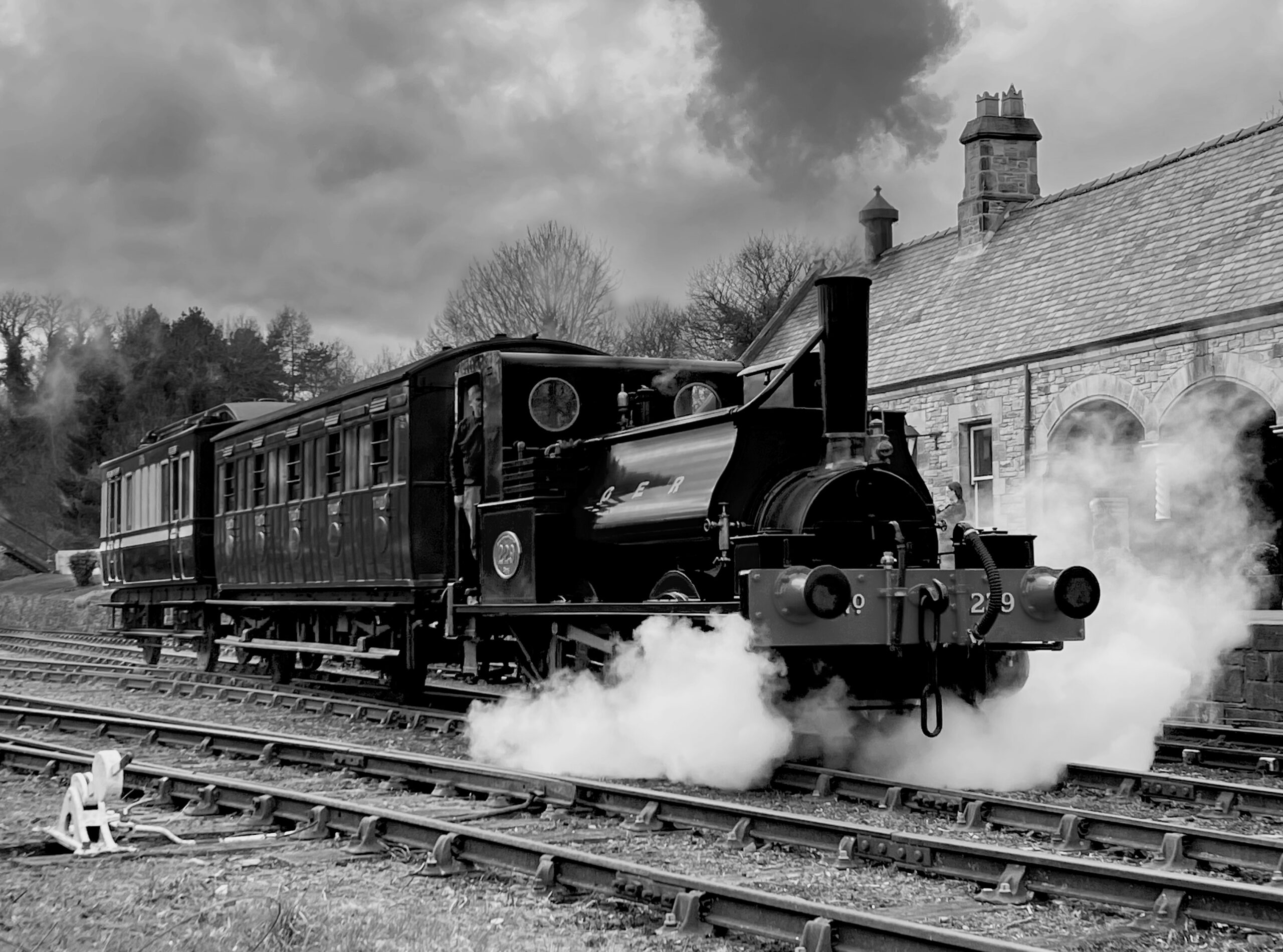 Below: The recent clearance of trees and vegetation in the Rowley Station area has restored views of the station and trains that were starting to become obscured. No.229 is seen during one of its test runs, matched to the Highland Railway-liveried North London Railway coach, and the Duke of Sutherland’s luggage saloon. (photo by Dave Hewitt)