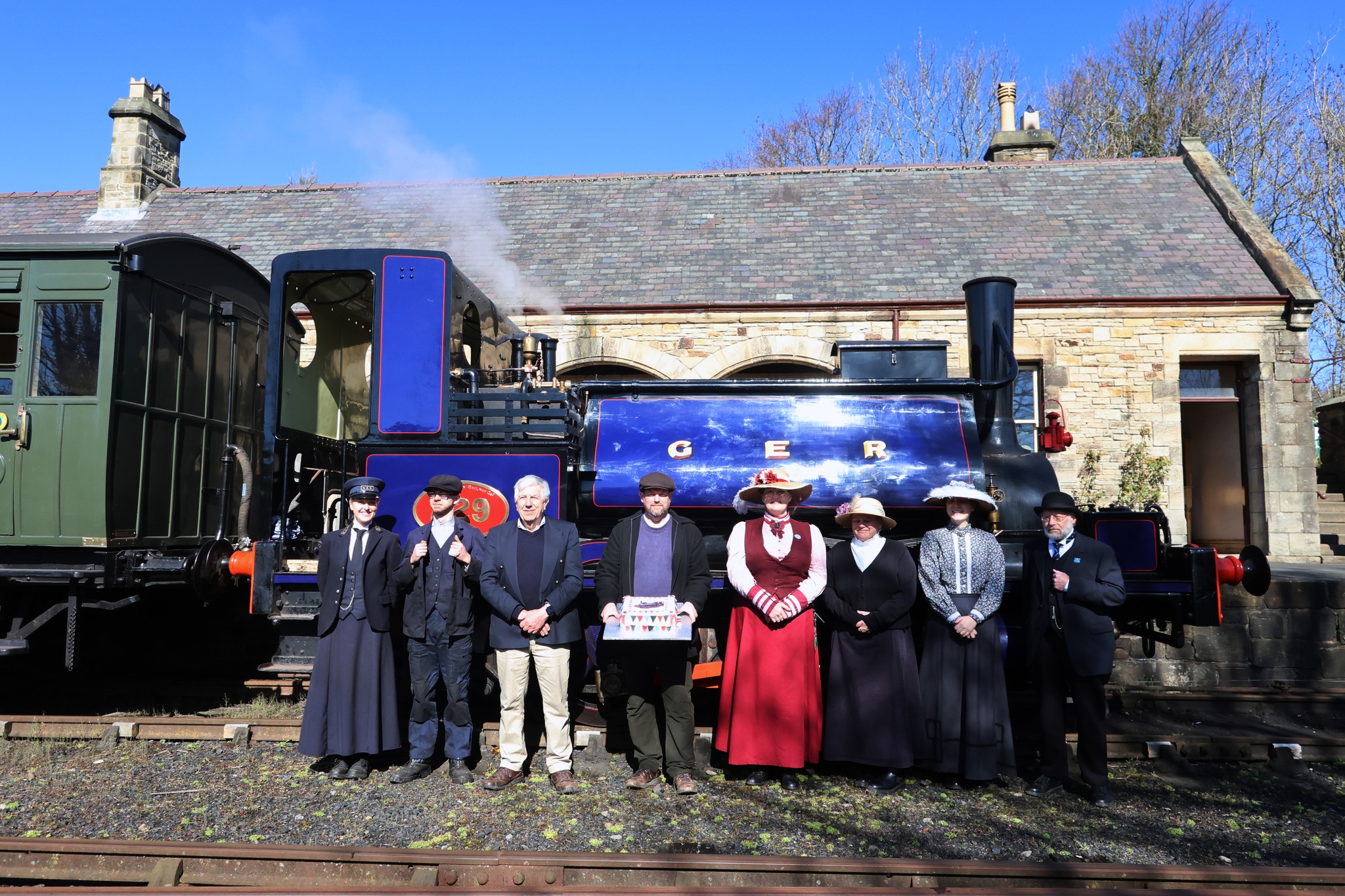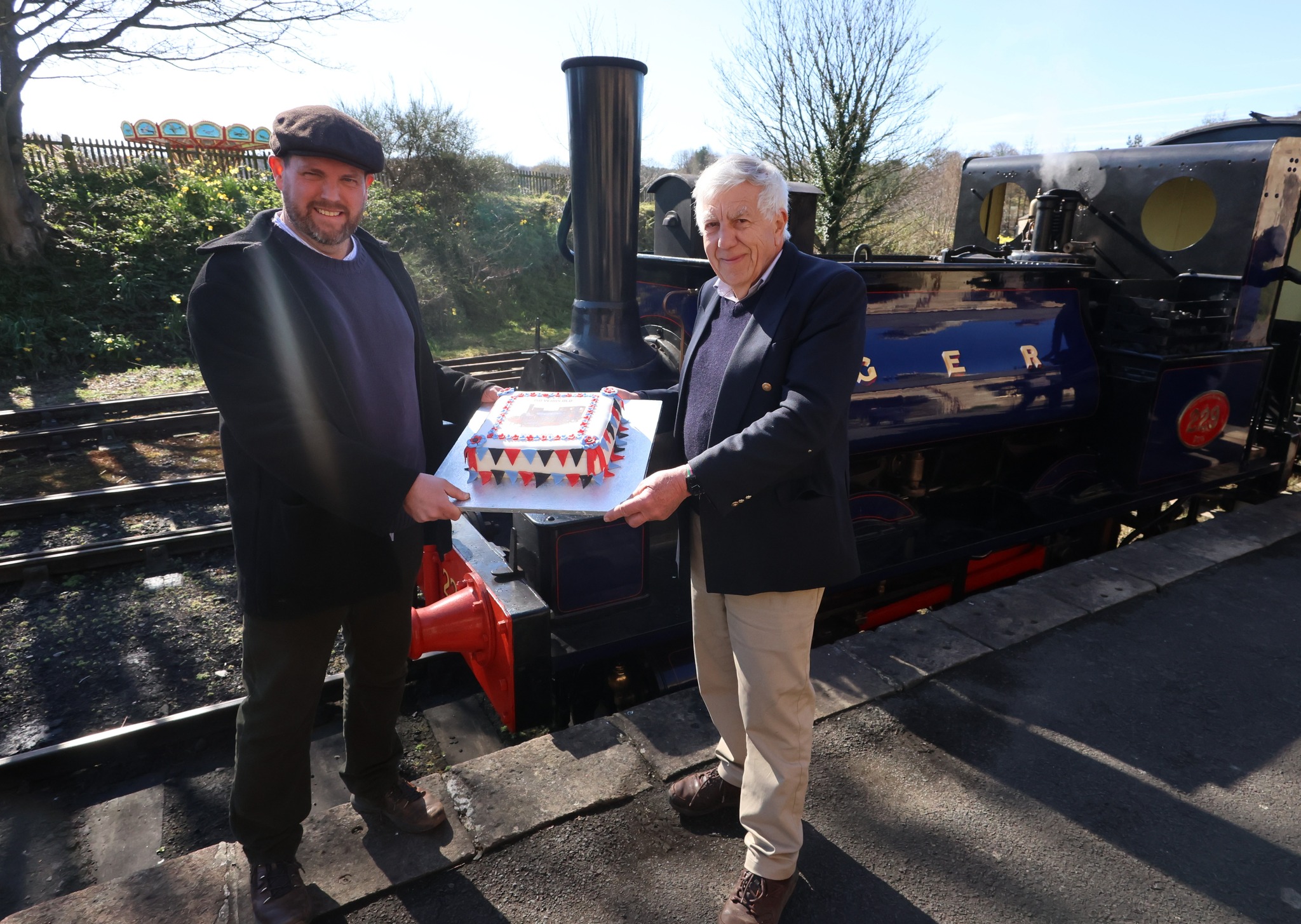 Below: 229’s birthday and entry into service as a passenger-hauling locomotive was marked with the presentation of a cake, baked in Beamish’s own bakery, on Thursday 2nd April. 229’s owner, Bill Parker (on the right), and I present the fabulously decorated cake to 229 for its birthday…